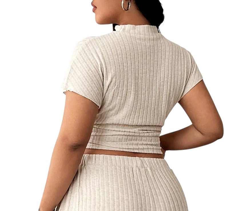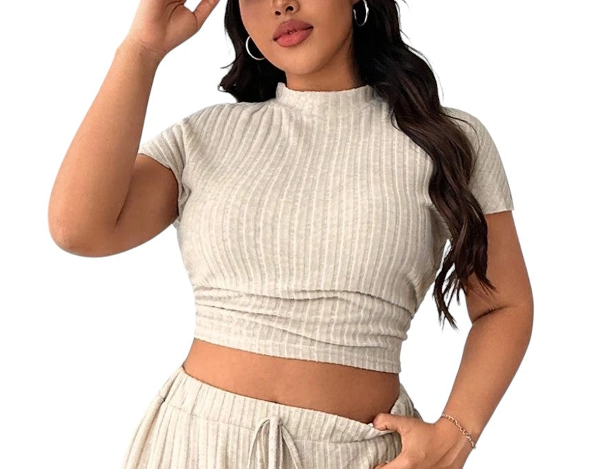Címke nélküli, törtfehér, magas nyakú, rövid ujjú, bordázott crop top