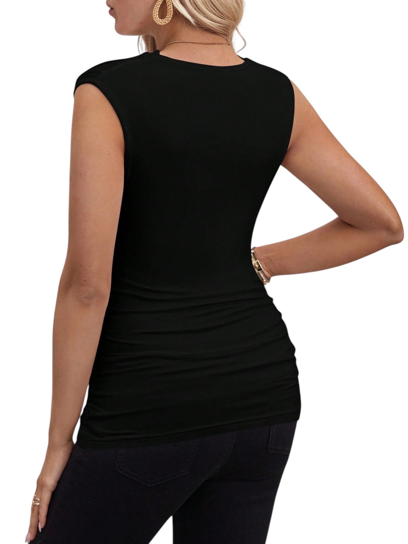 Címke nélküli, fekete, garbós nyakú, ujjatlan kismama top ráncolt oldallal