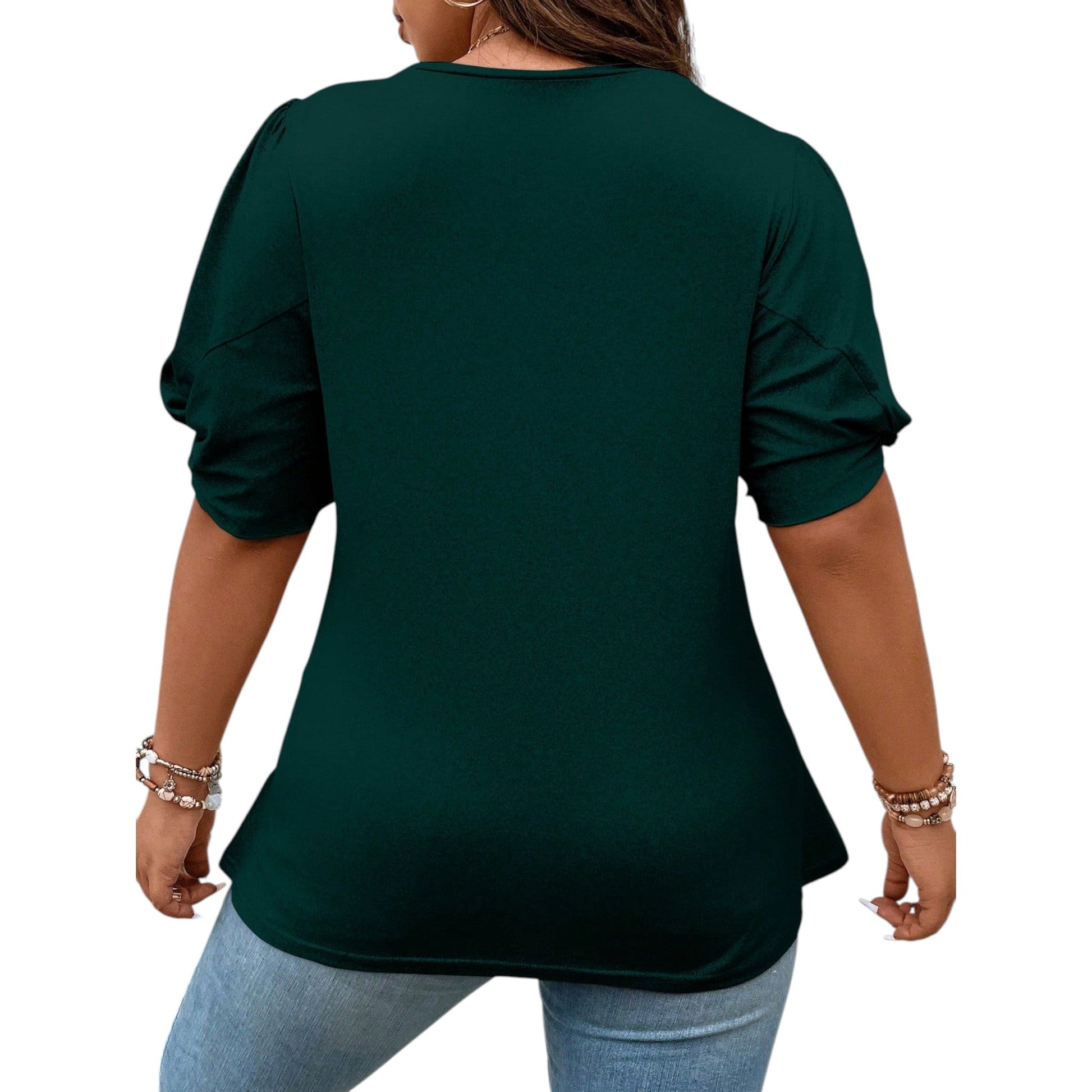 Címke nélküli, sötétzöld, rövid ujjú, ejtett vállú, elöl kivágott, nyaknál ráncolt felső.