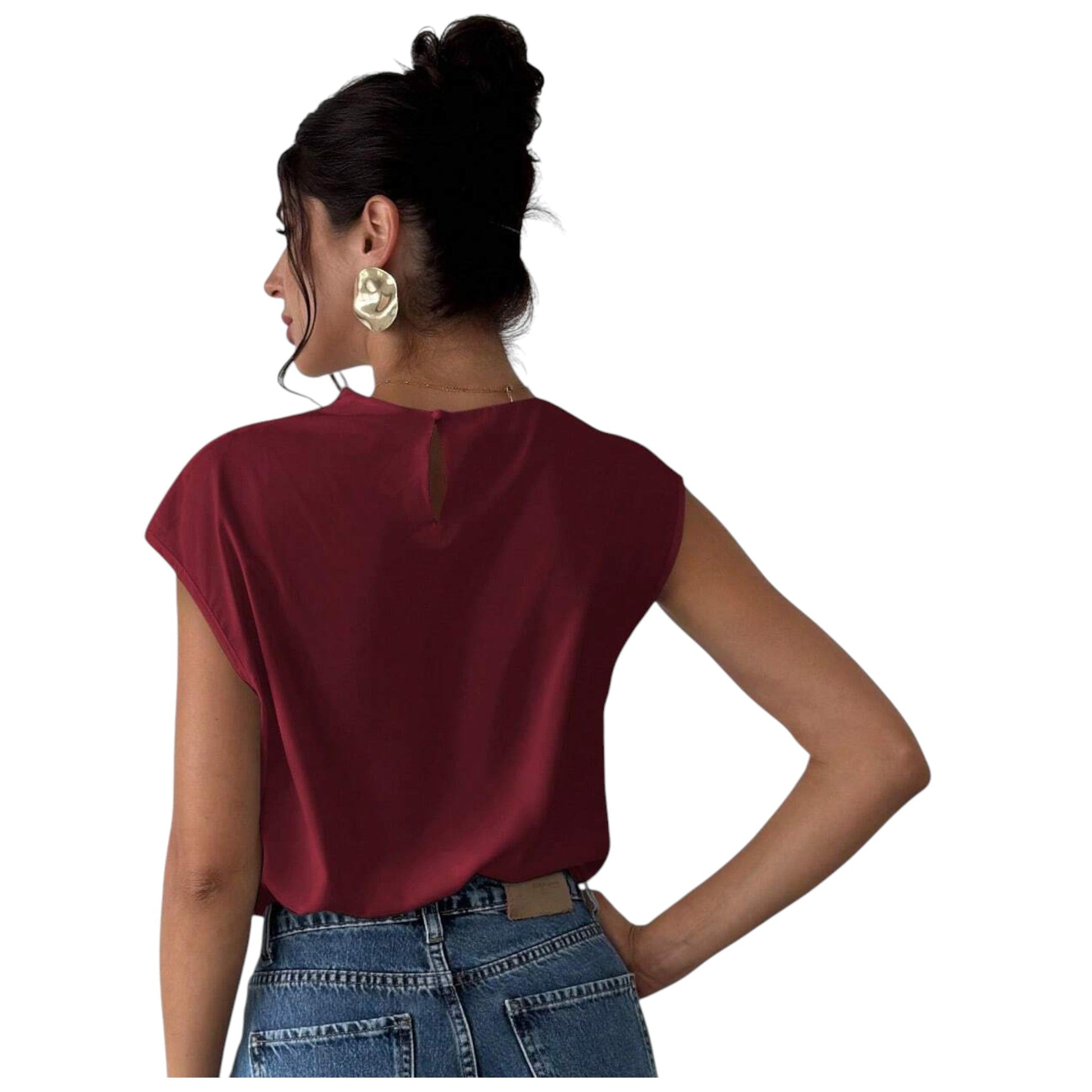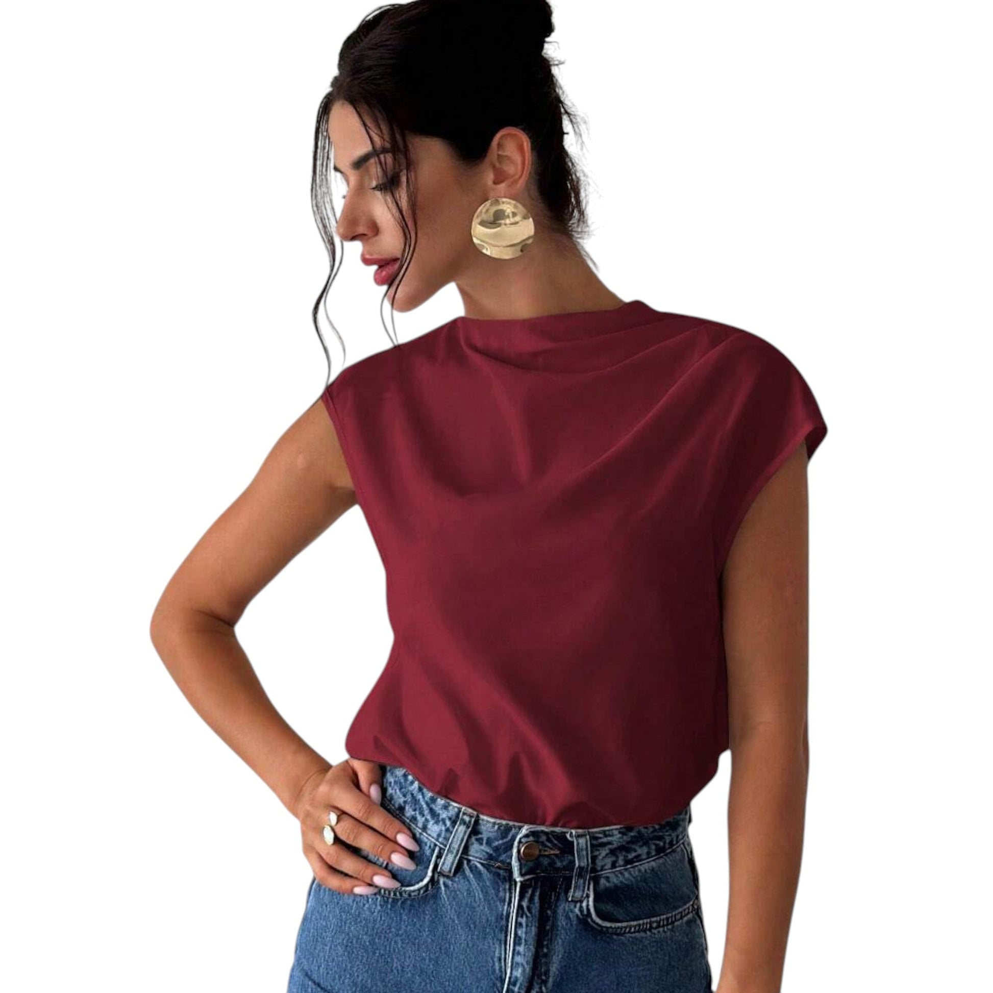 Címke nélküli, bordó, ujjatlan top, kerek nyakkal és ejtett vállal.