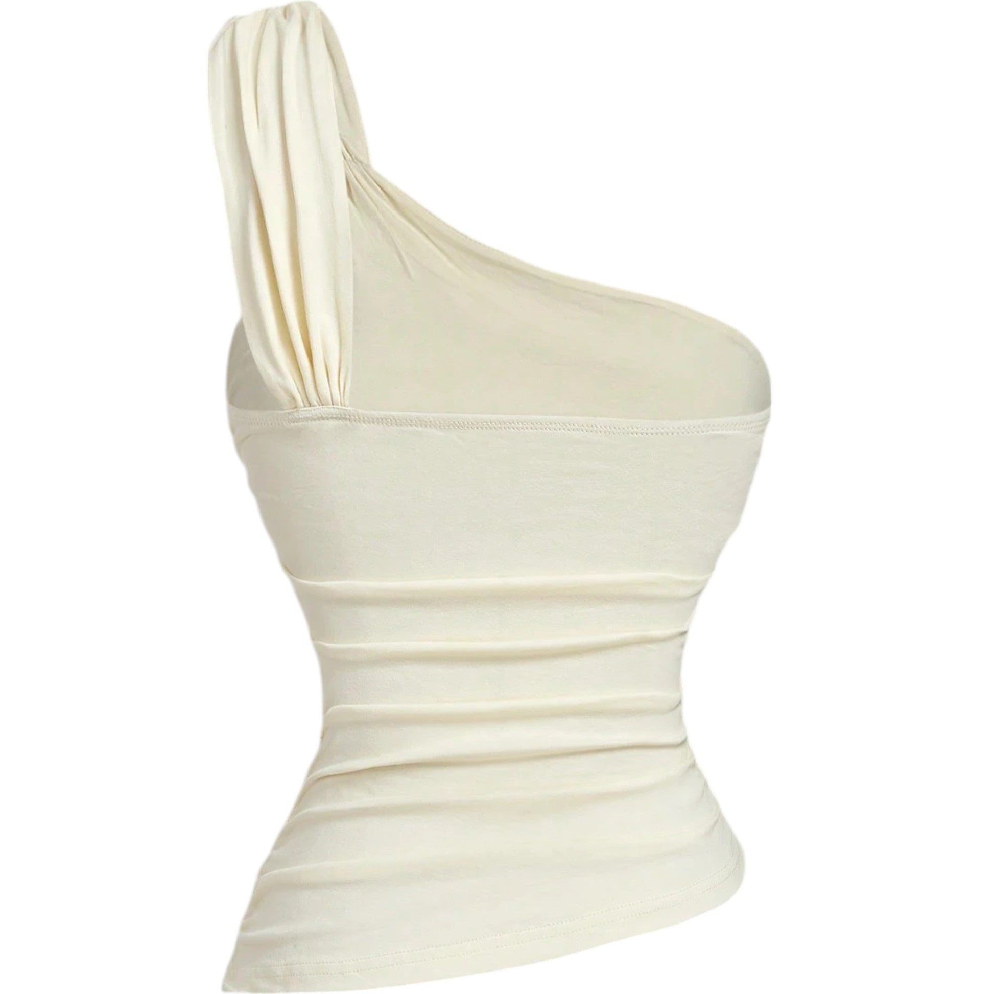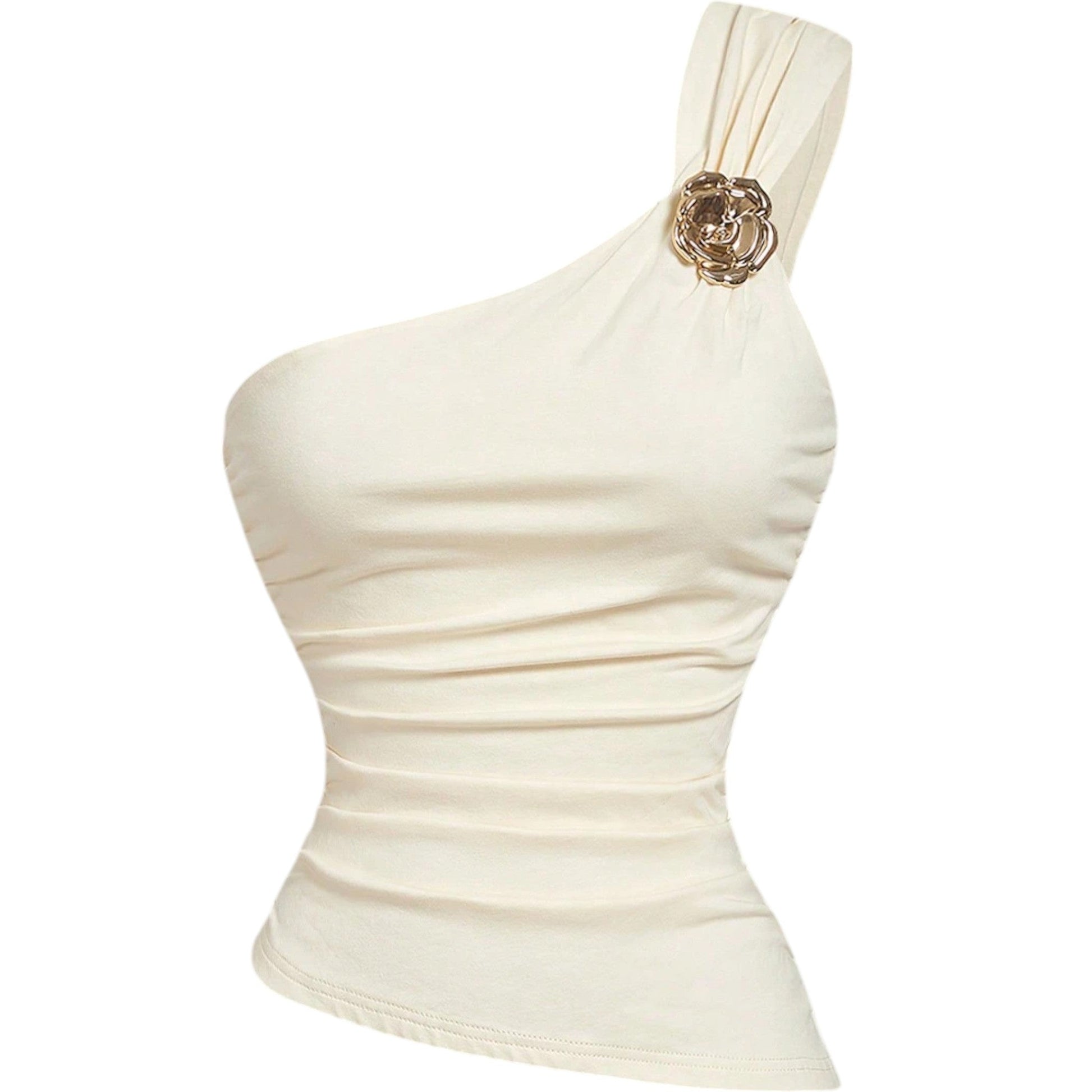 Címke nélküli, ekrü, félvállas, ráncolt felső, arany színű fém dísszel a vállán.