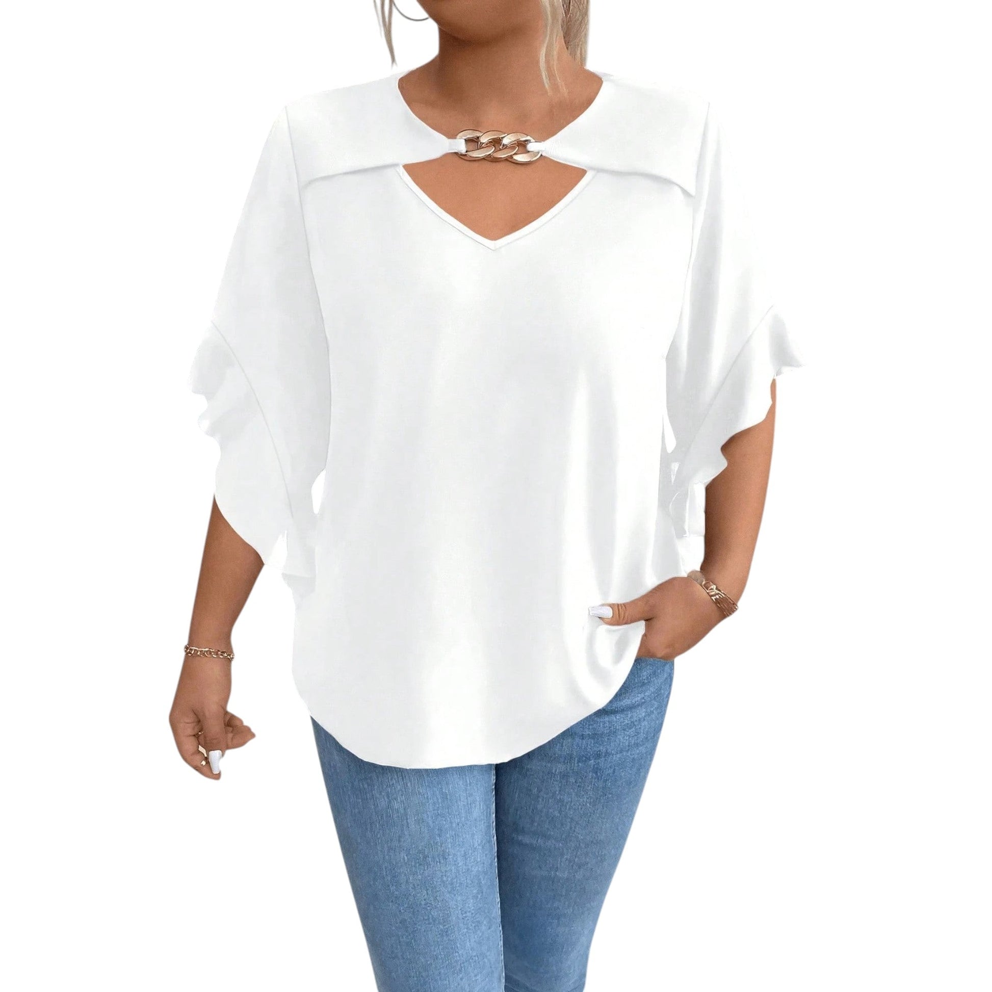 Címke nélküli, fehér, V-nyakú, rövid ujjú, láncdíszes blúz.