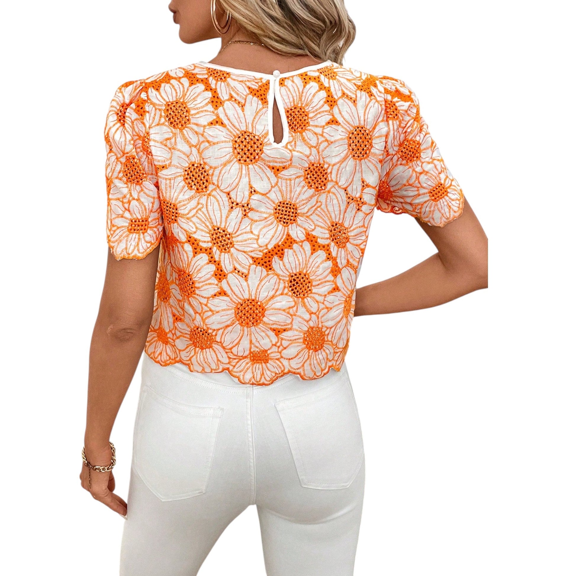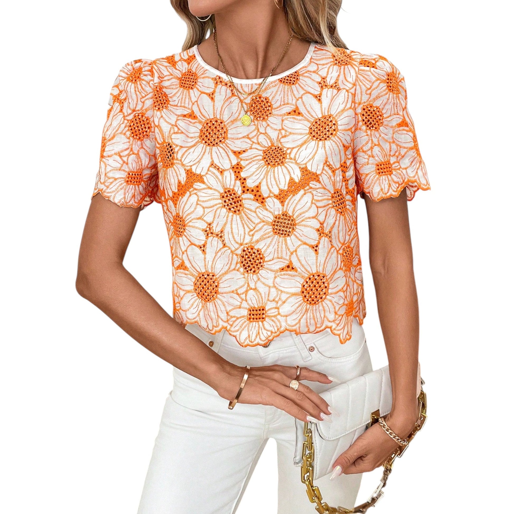 Címke nélküli, narancssárga és fehér, virágmintás, rövid ujjú, kerek nyakú, crop.