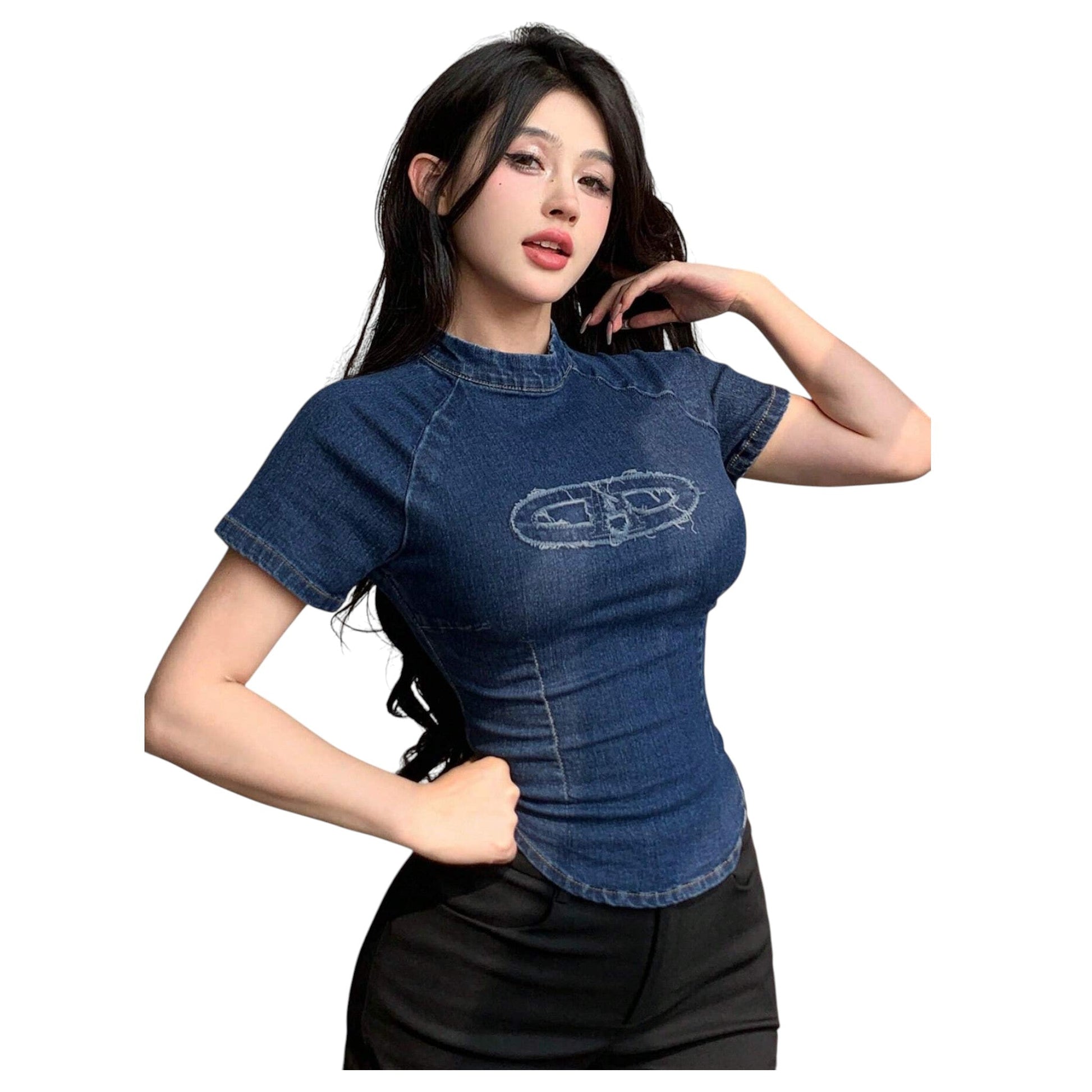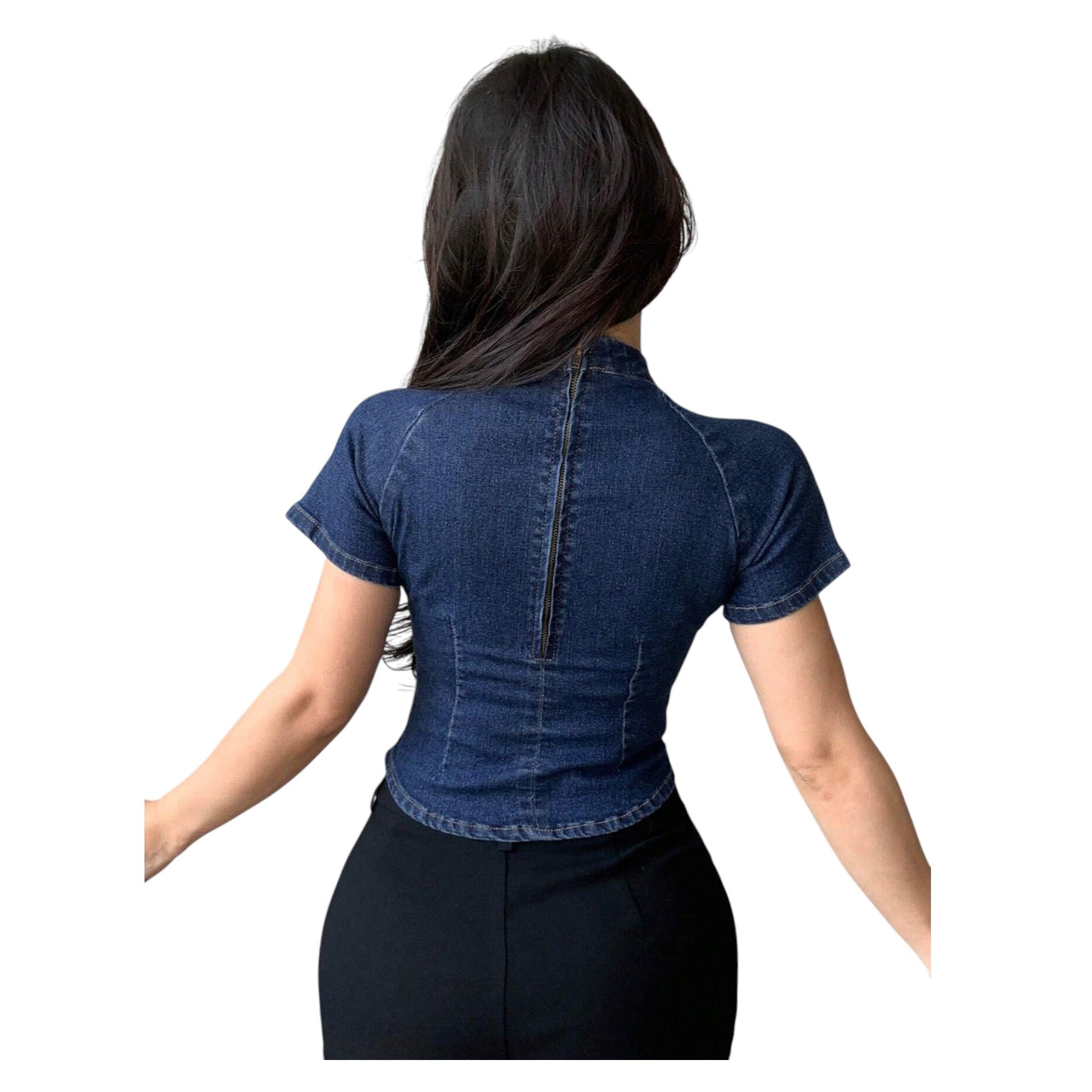 Címke nélküli, farmerkék, magasított nyakú, rövid ujjú, ívelt aljú, testhezálló.