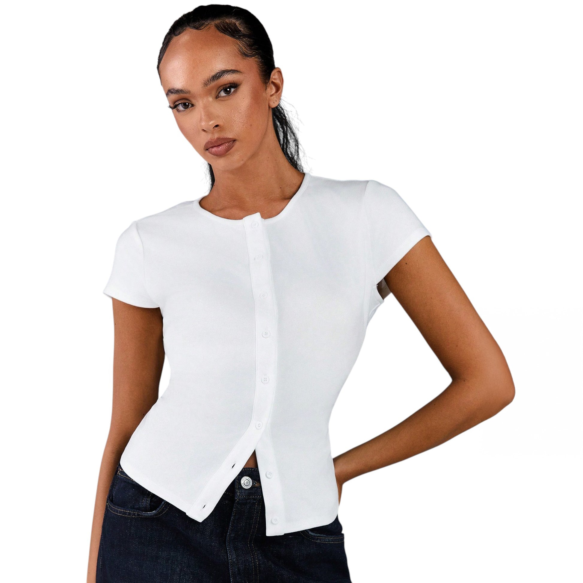 Címke nélküli, ekrü, kerek nyakú, rövid ujjú póló, elől végig gombokkal.