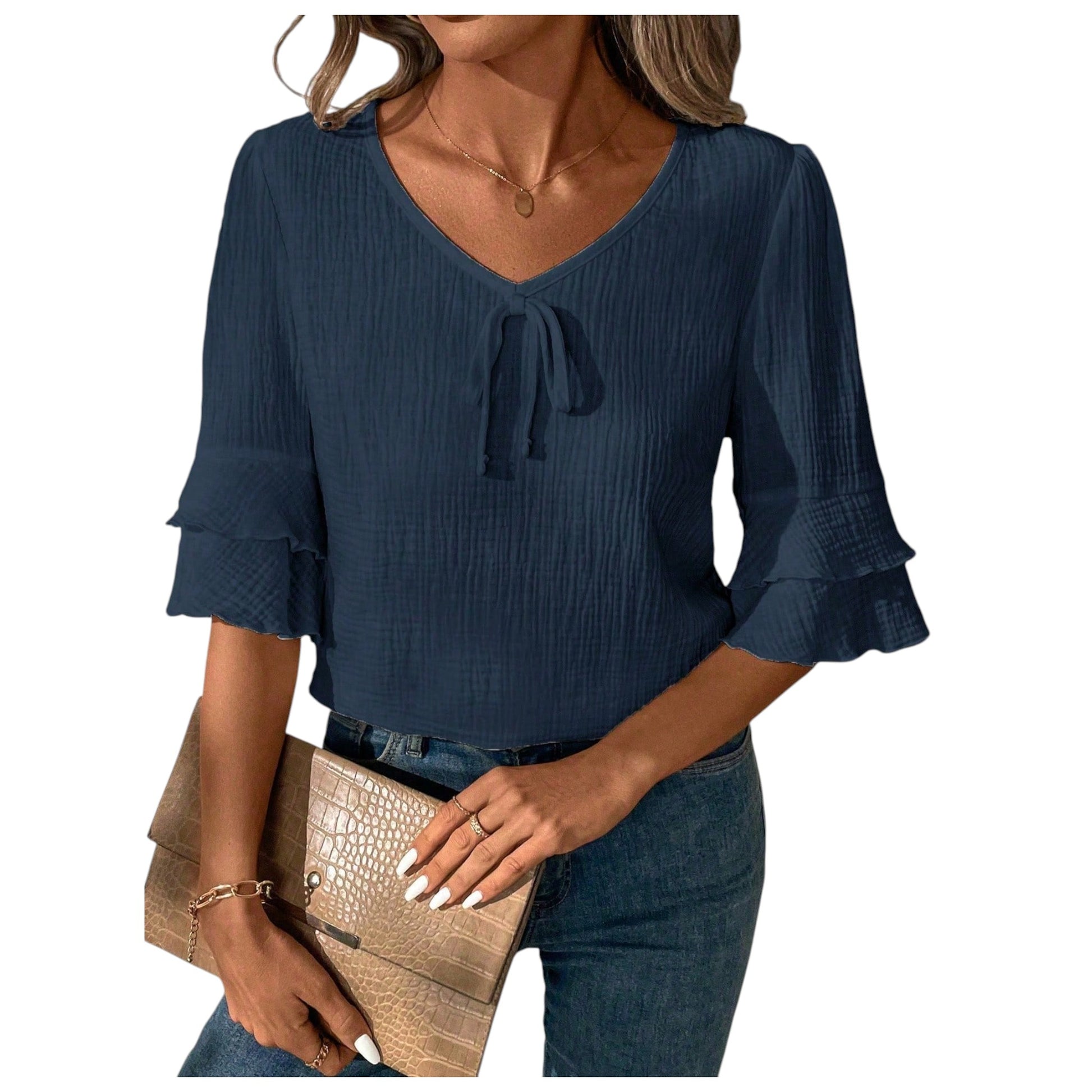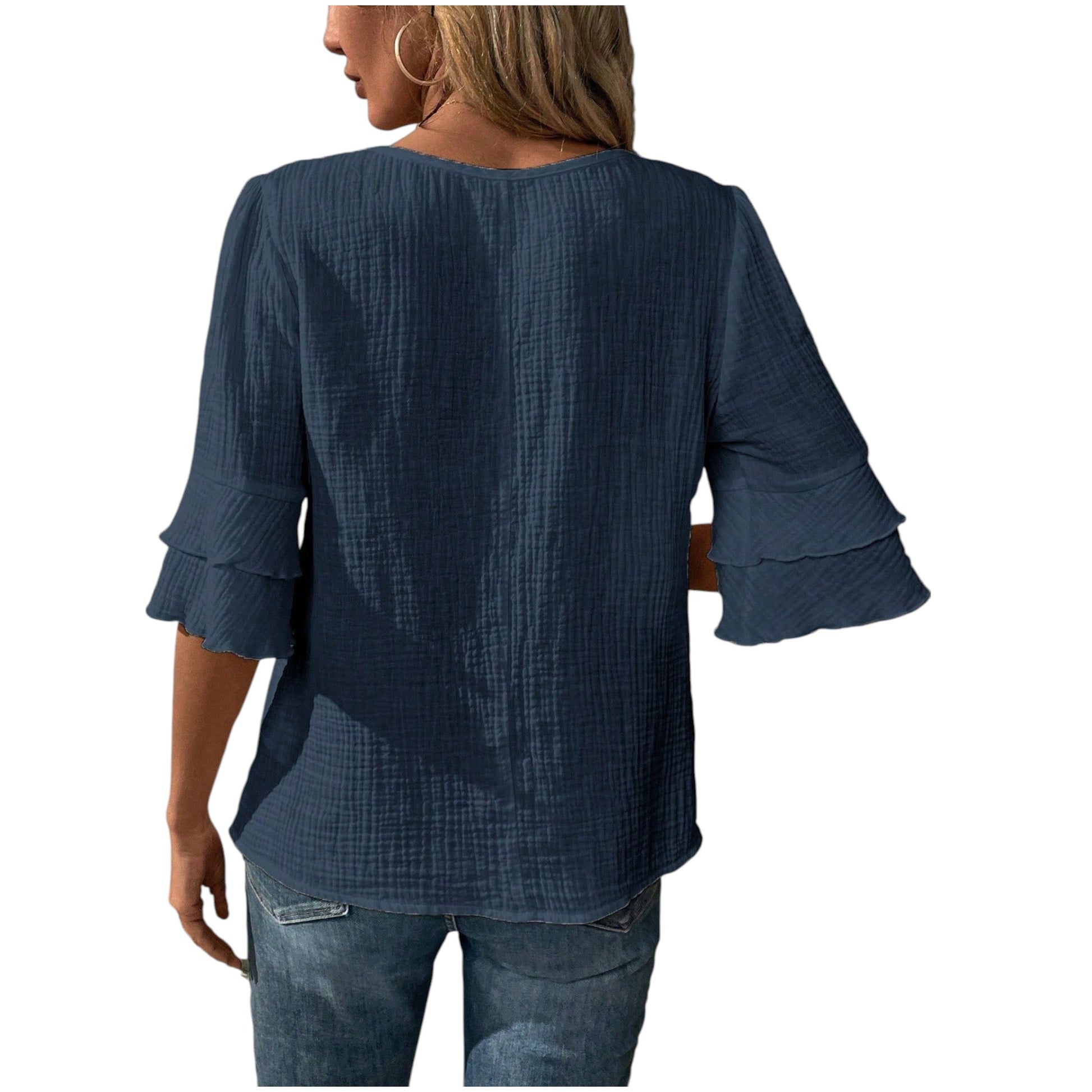 Címke nélküli, kék, V-nyakú, nyakkendős részlettel, 3/4-es, kétrétegű, fodros ujjú blúz.