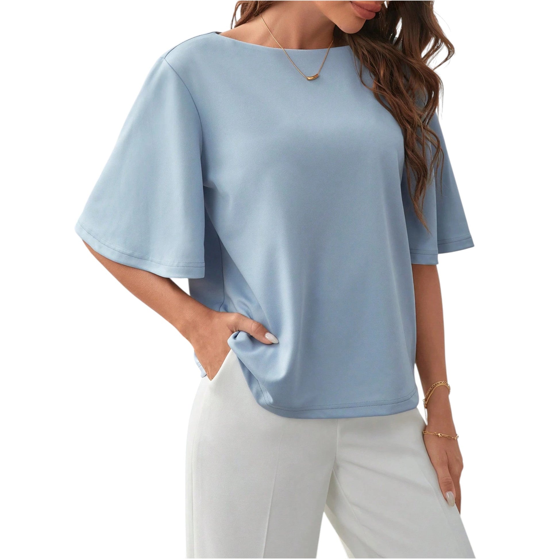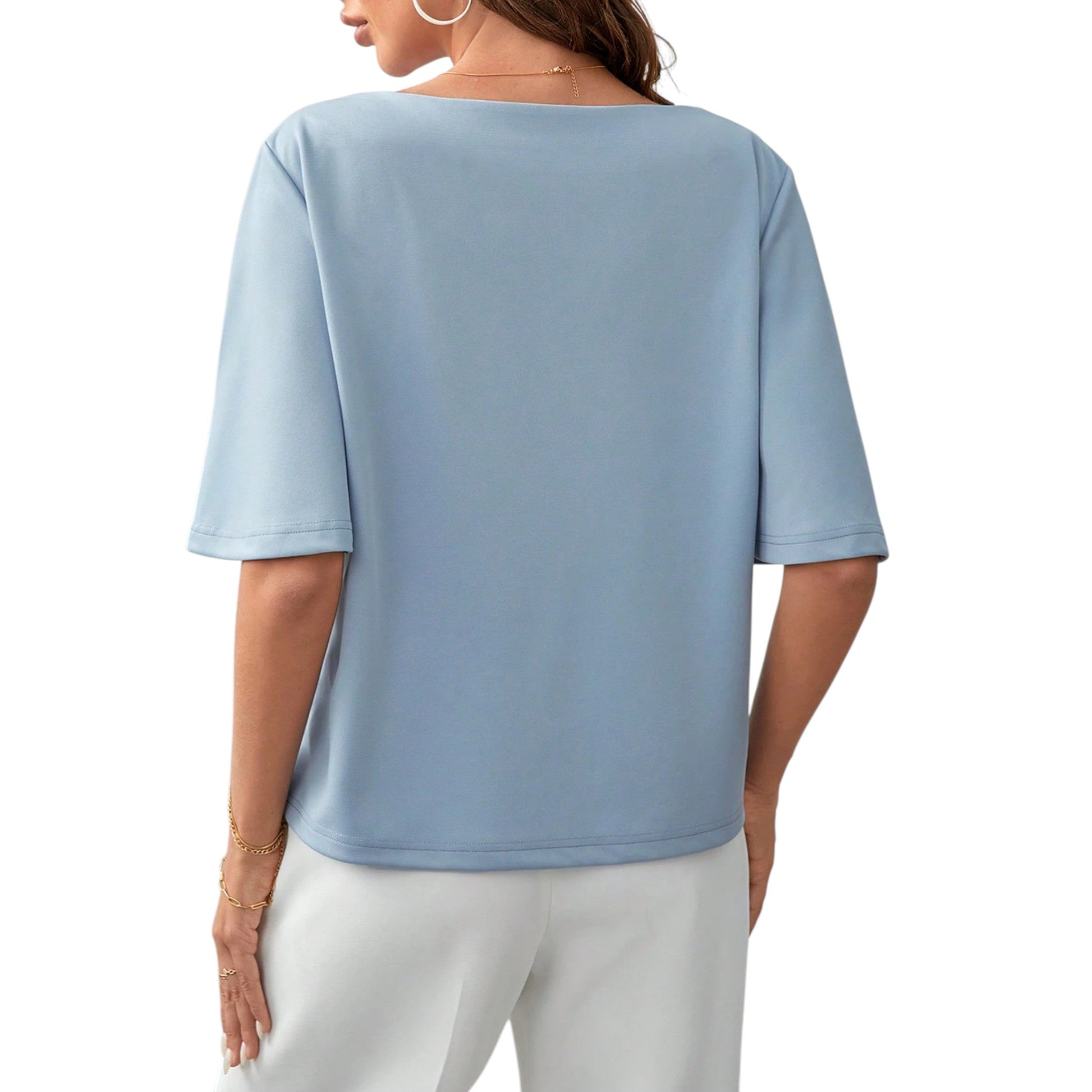 Címke nélküli, világoskék, csónaknyakú, rövid, ejtett ujjú, egyenes szabású.