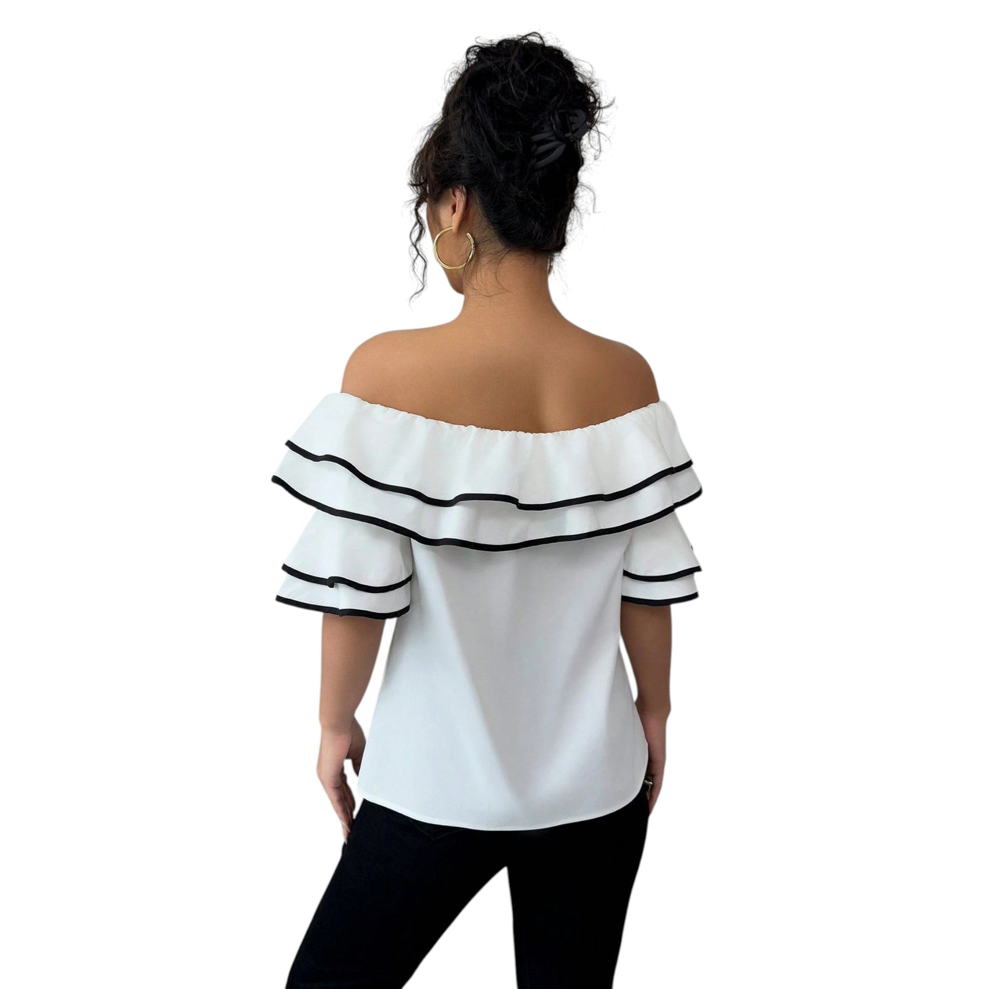 Címke nélküli, fehér, váll nélküli, fodros szegéllyel a nyakkivágásnál és az ujjakon, rövid ujjú.
