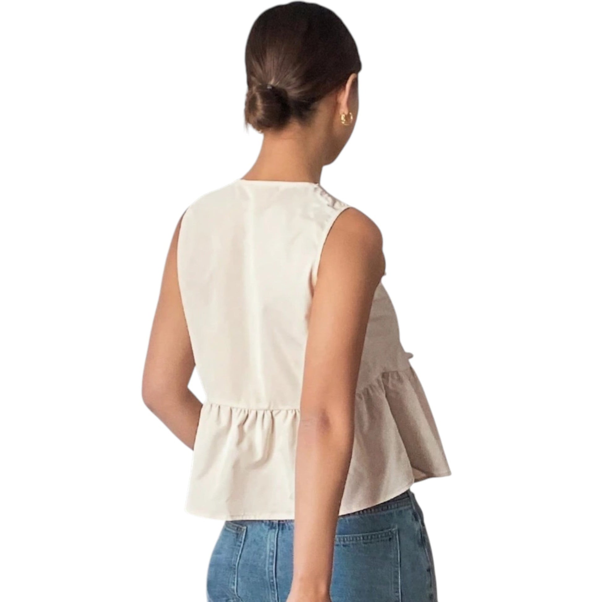 Címke nélküli, drapp, ujjatlan, elöl hímzett virág mintával, megkötős, mély v-nyakú, fodros aljú.