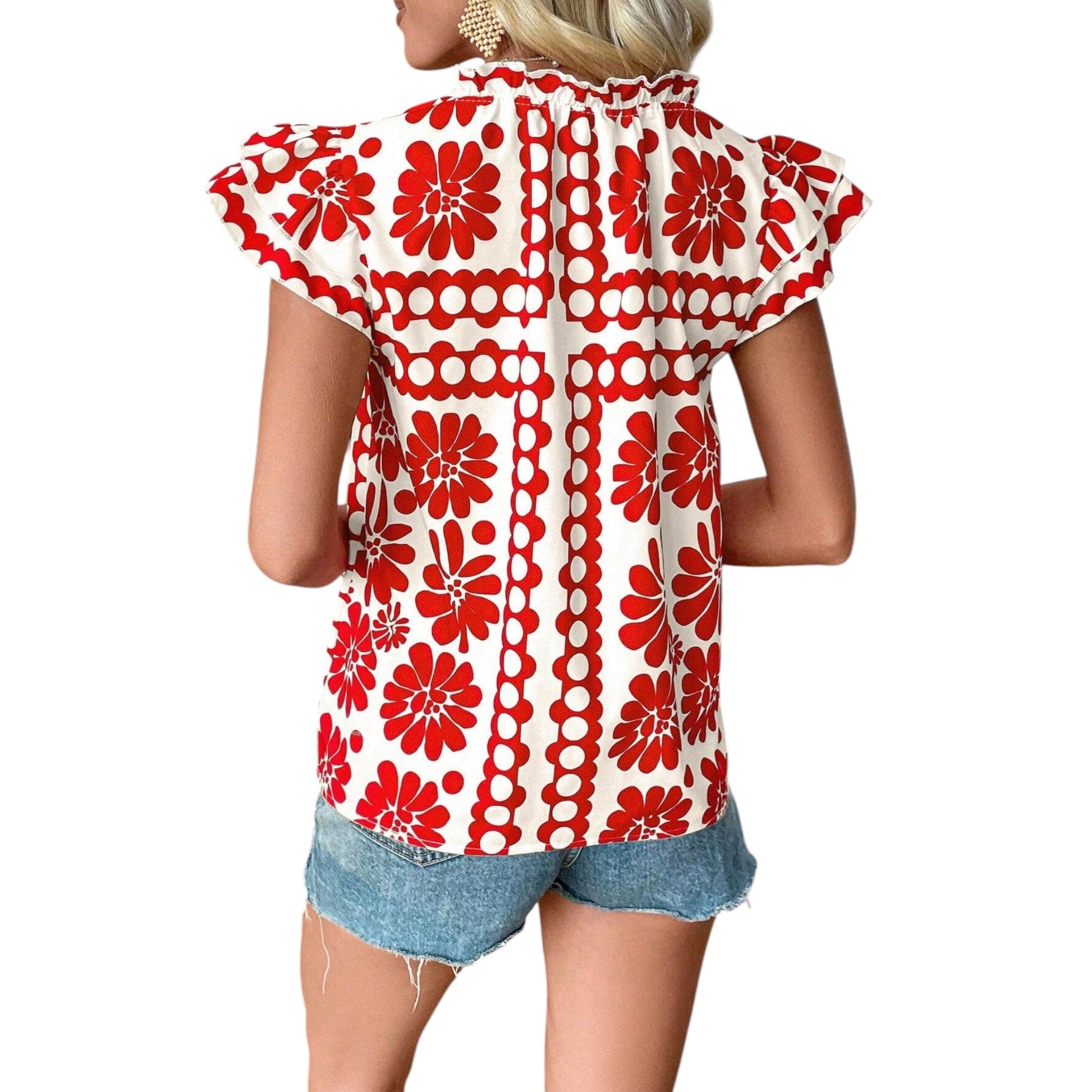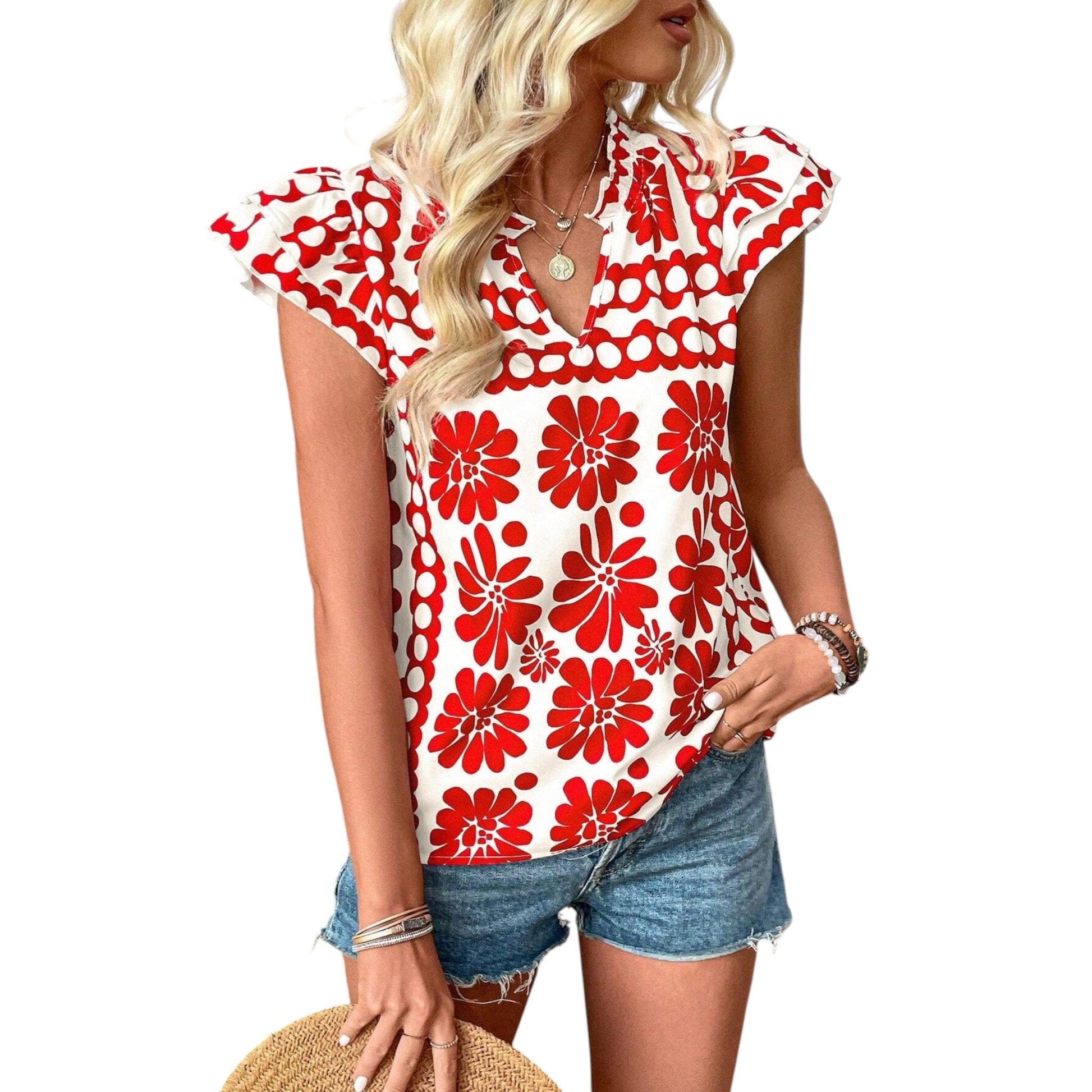 Címke nélküli, ekrü és piros, virág és pötty mintás, v-nyakú, fodros rövid ujjú.