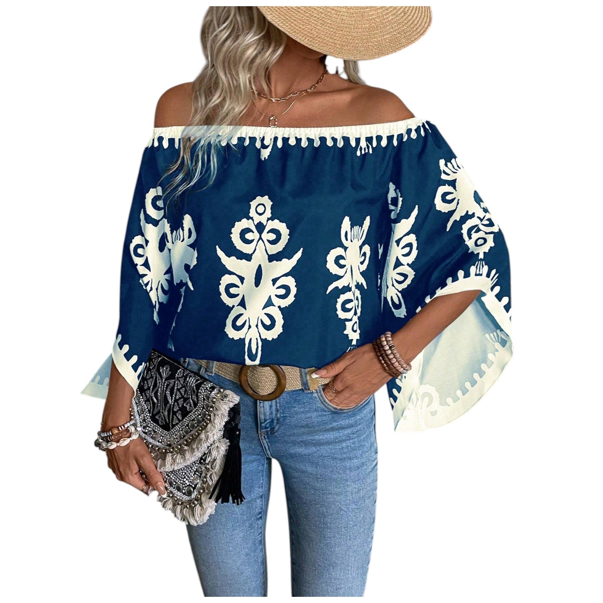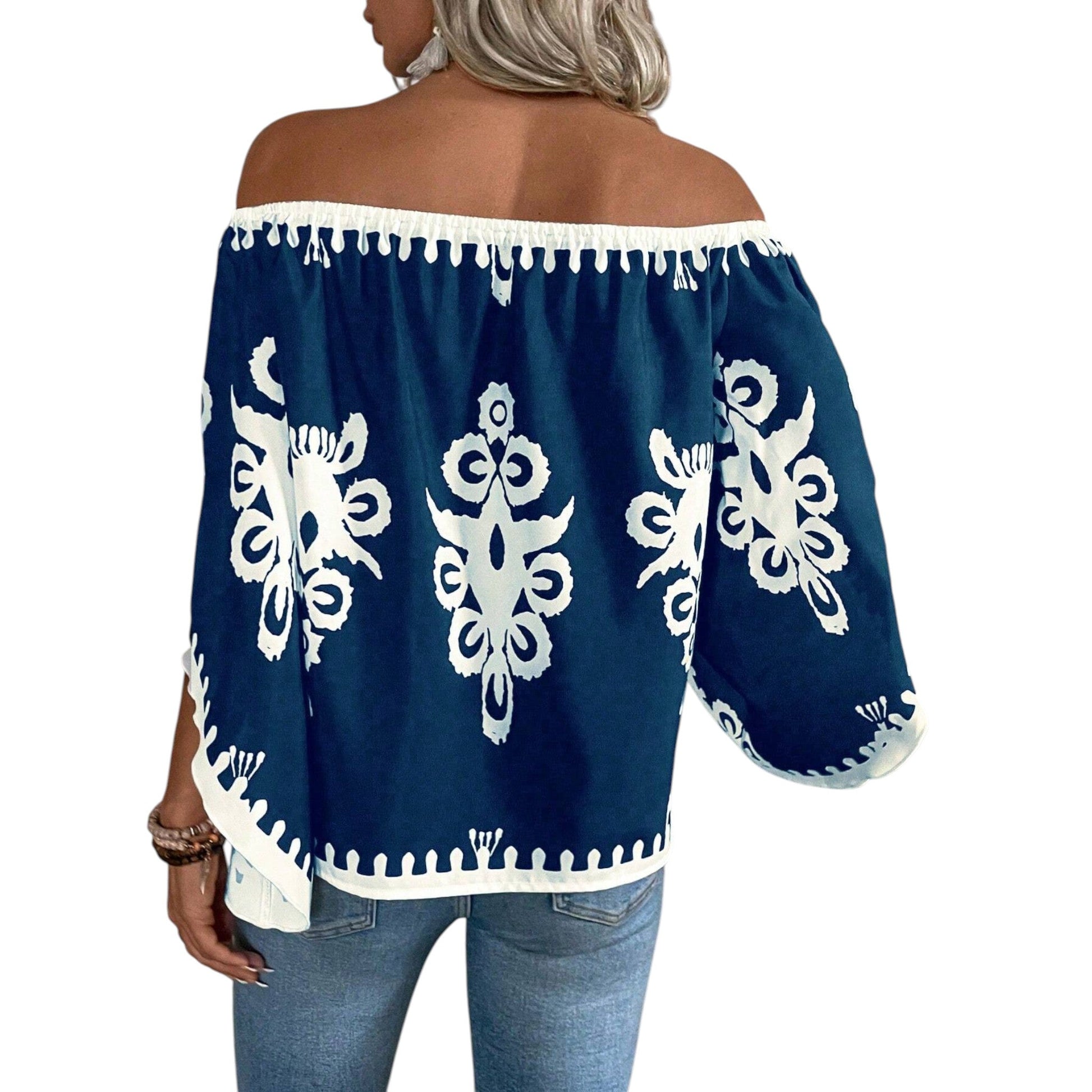 Címke nélküli, kék és fehér, geometrikus mintás, váll nélküli, rövid, puffos, harang ujjú.