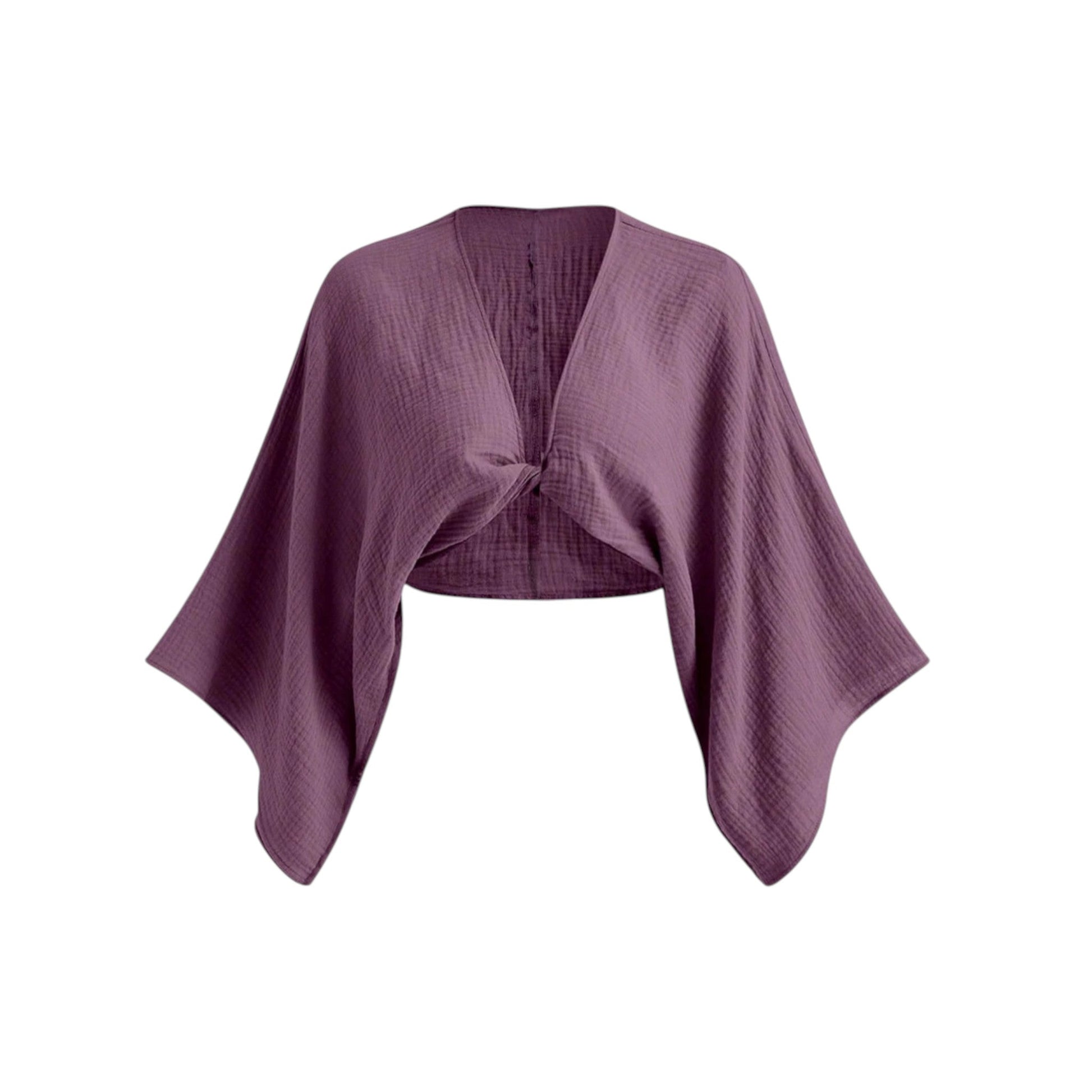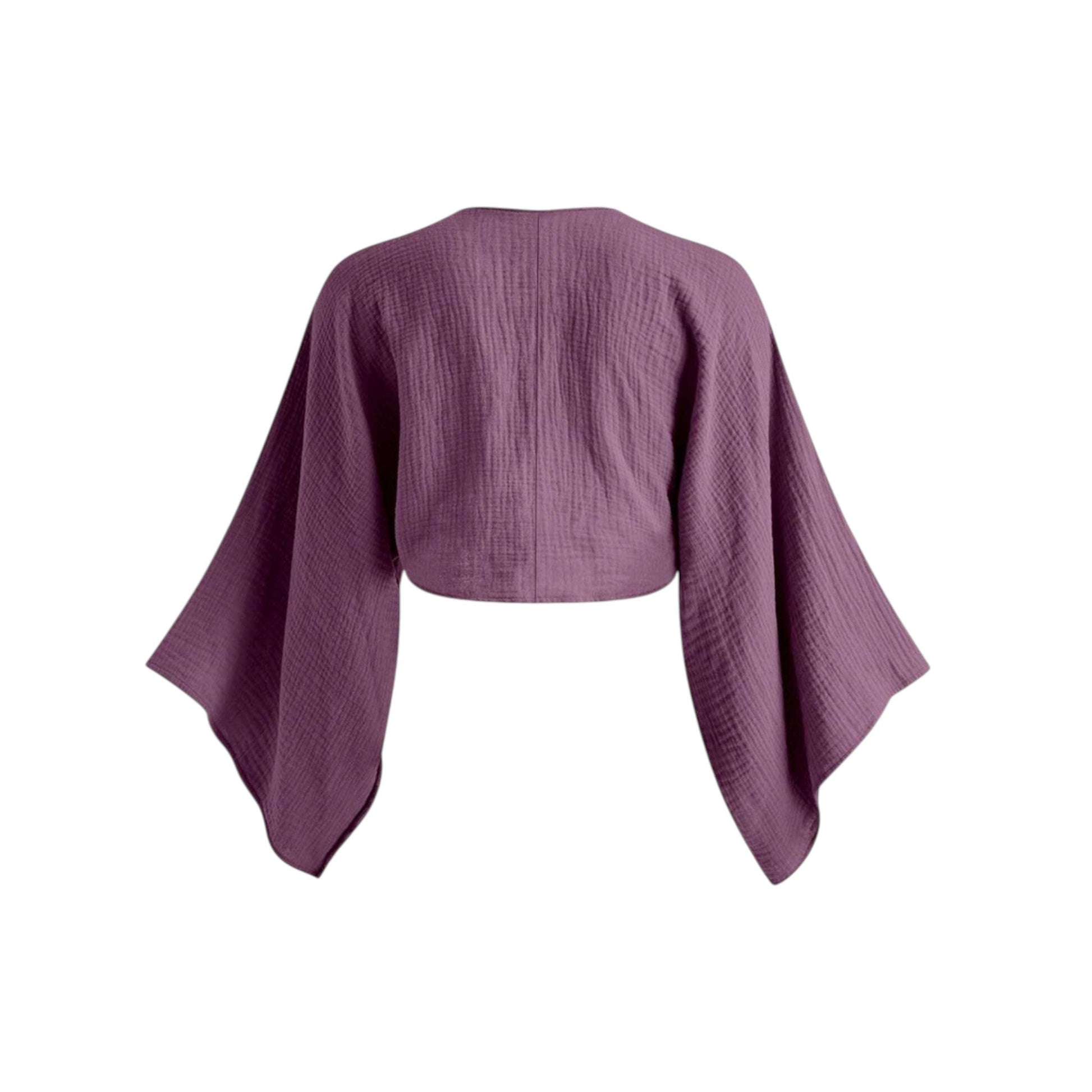 Címke nélküli, lila, elöl megkötős, crop fazonú, bő, ejtett ujjú, muszlin.