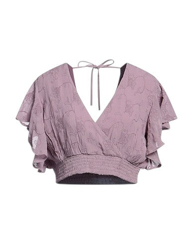 Címke nélküli, mályva, texturált, hímzett anyag, rövid, átlapolós crop top fazon, V-nyakkivágás, rövid pillangóujjak, gumis derékrész, hátul megkötős.