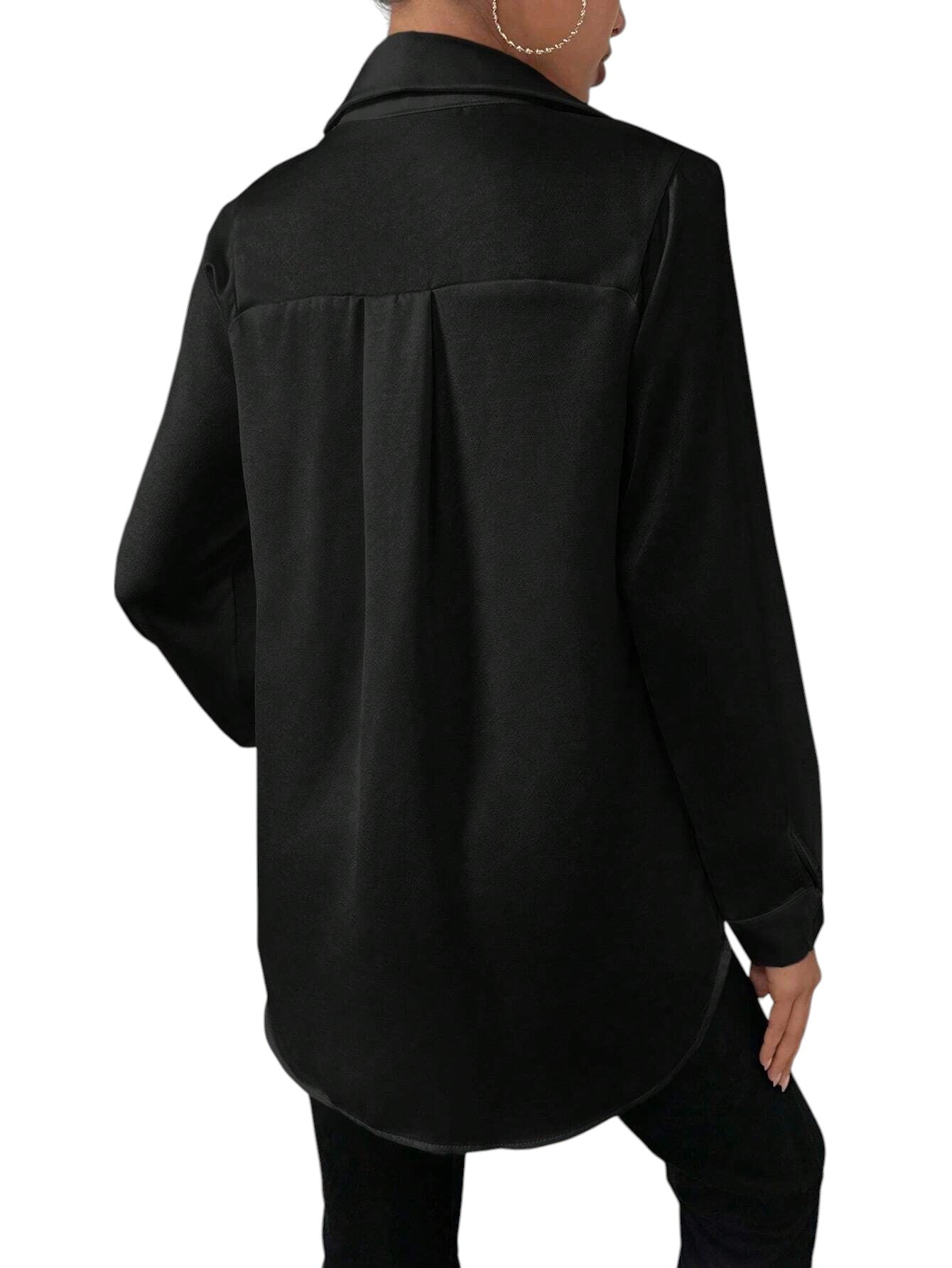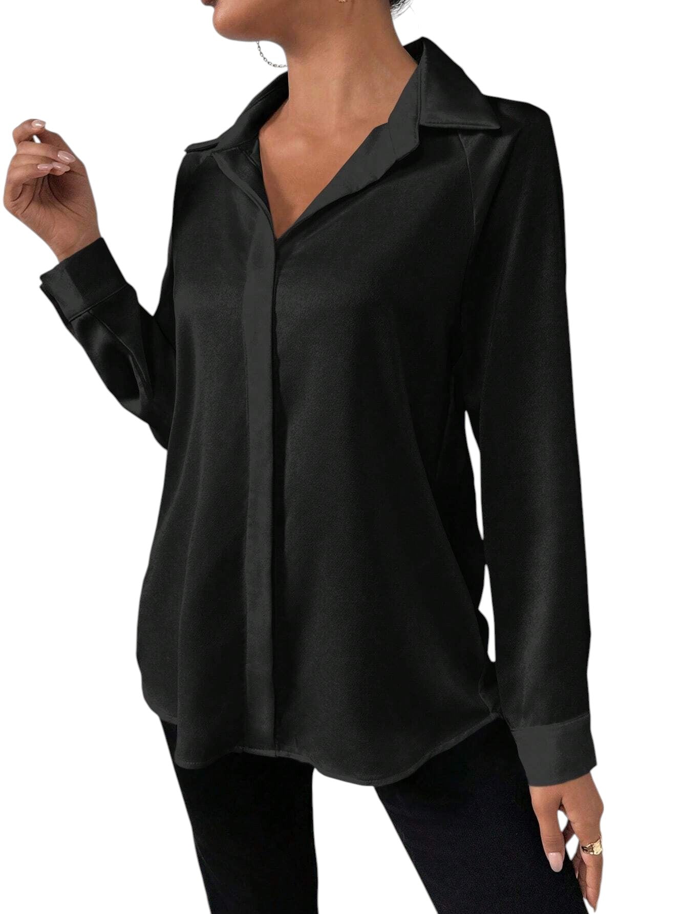 Címke nélküli, fekete, galléros, hosszú ujjú, gombos blúz