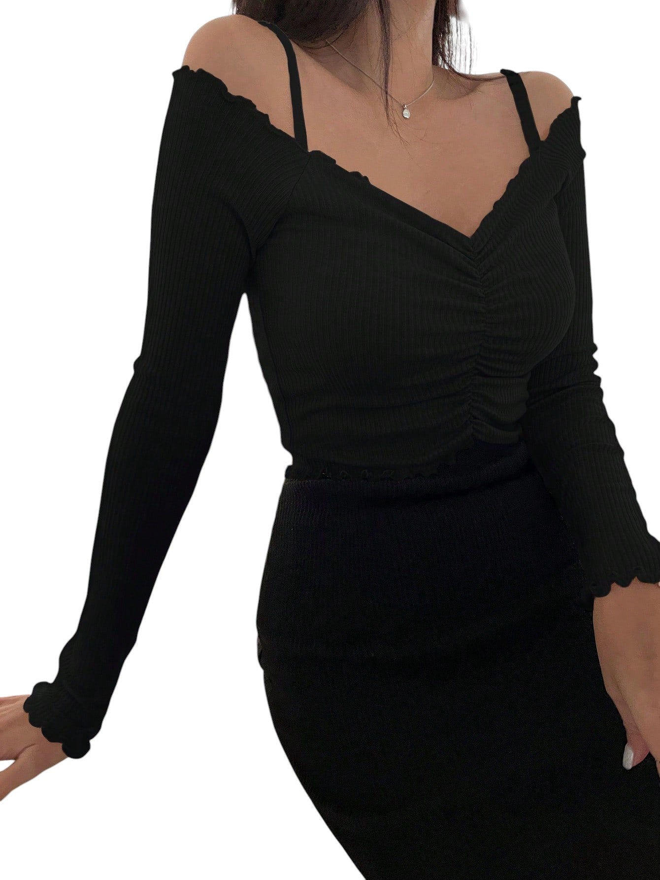 Címke nélküli, fekete, V-nyakú, vállpántos, hosszú ujjú felső fodros szegéllyel és hozzáillő szoknya szett