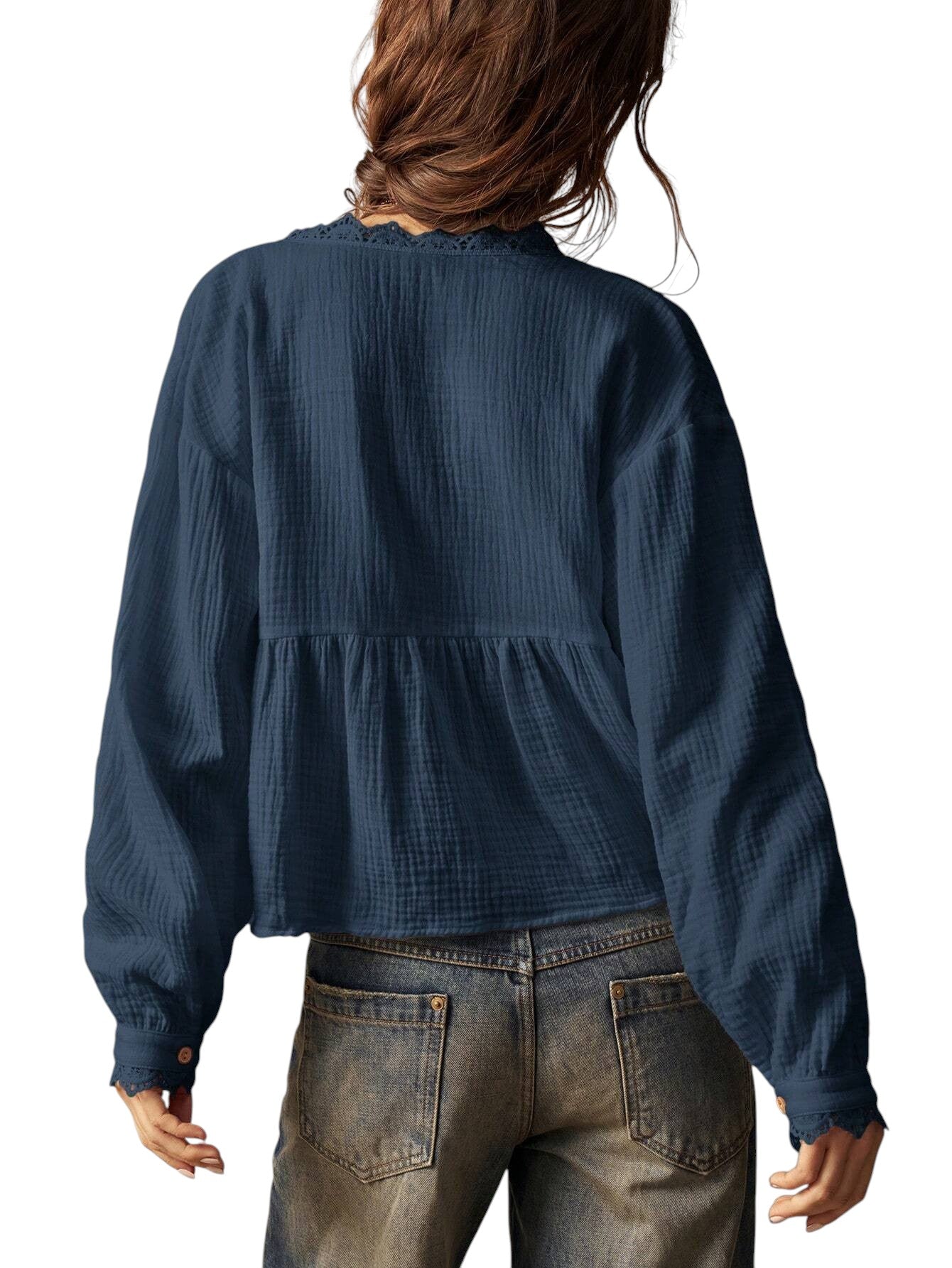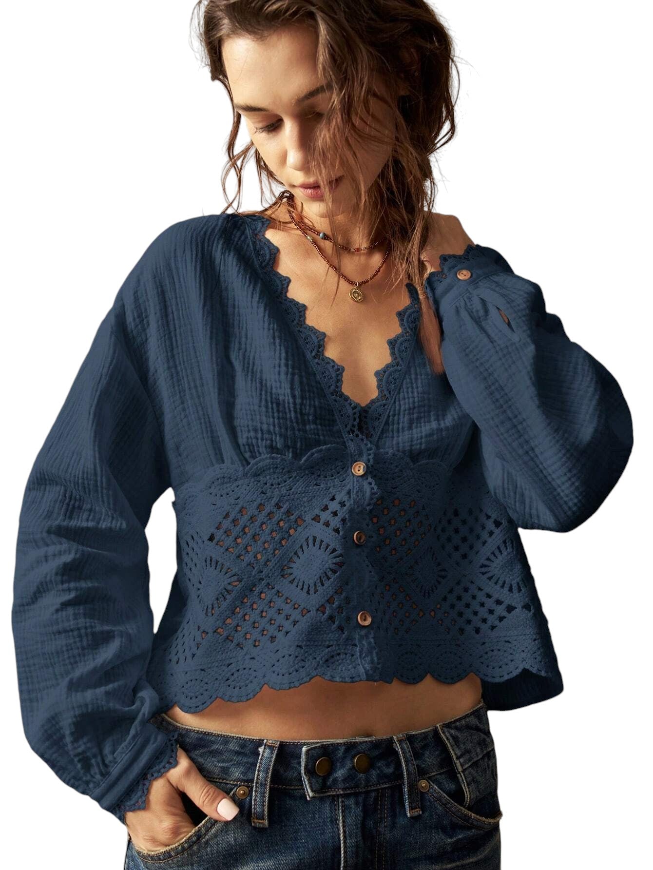 Címke nélküli, sötétkék, V-nyakú, hosszú ujjú, gombos blúz horgolt betéttel és csipkés szegéllyel