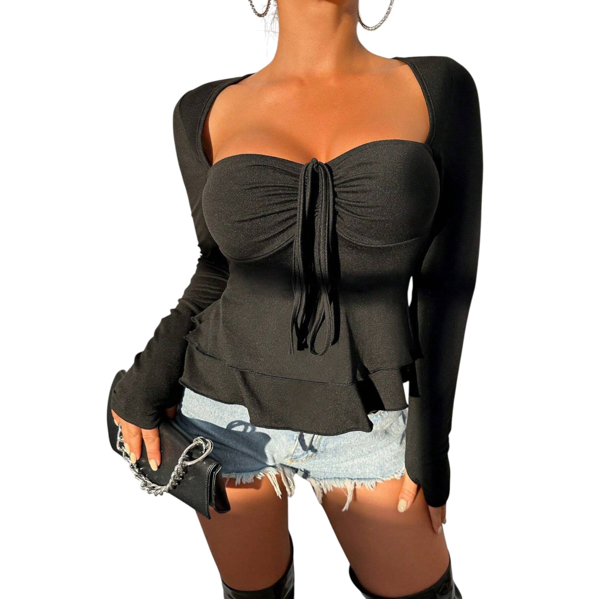 Címke nélküli, fekete, hosszú ujjú, szív alakú dekoltázsú, fodros aljú felső.