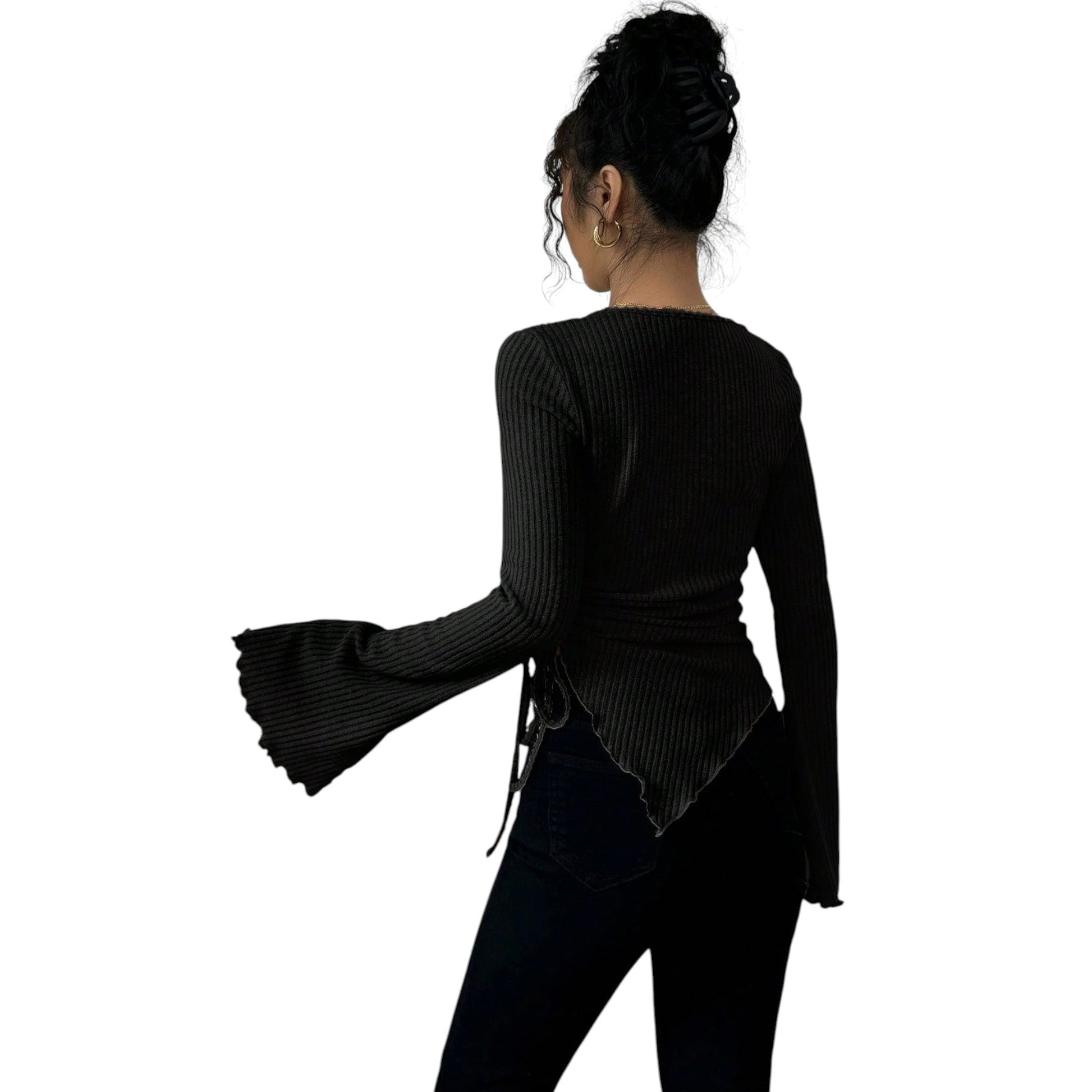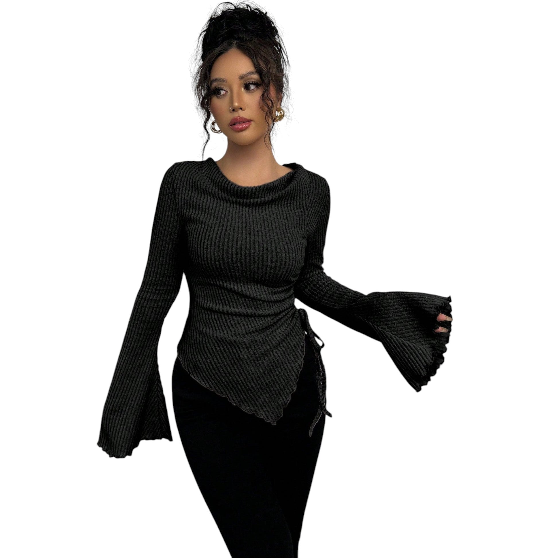 Címke nélküli, fekete, hosszú harangujjú, bordázott anyagú, oldalt húzott felső.