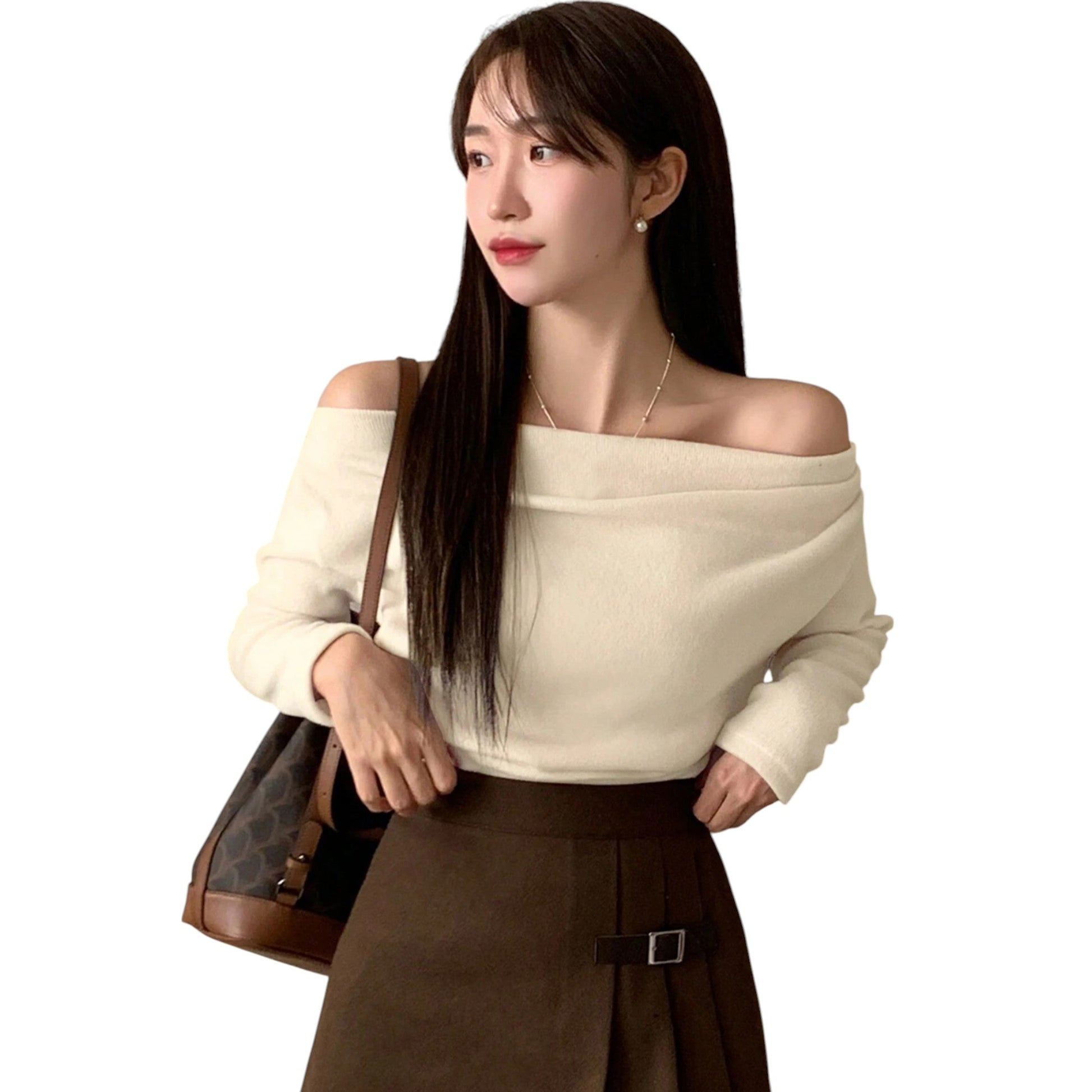 Címke nélküli, bézs, hosszú ujjú, váll nélküli felső.