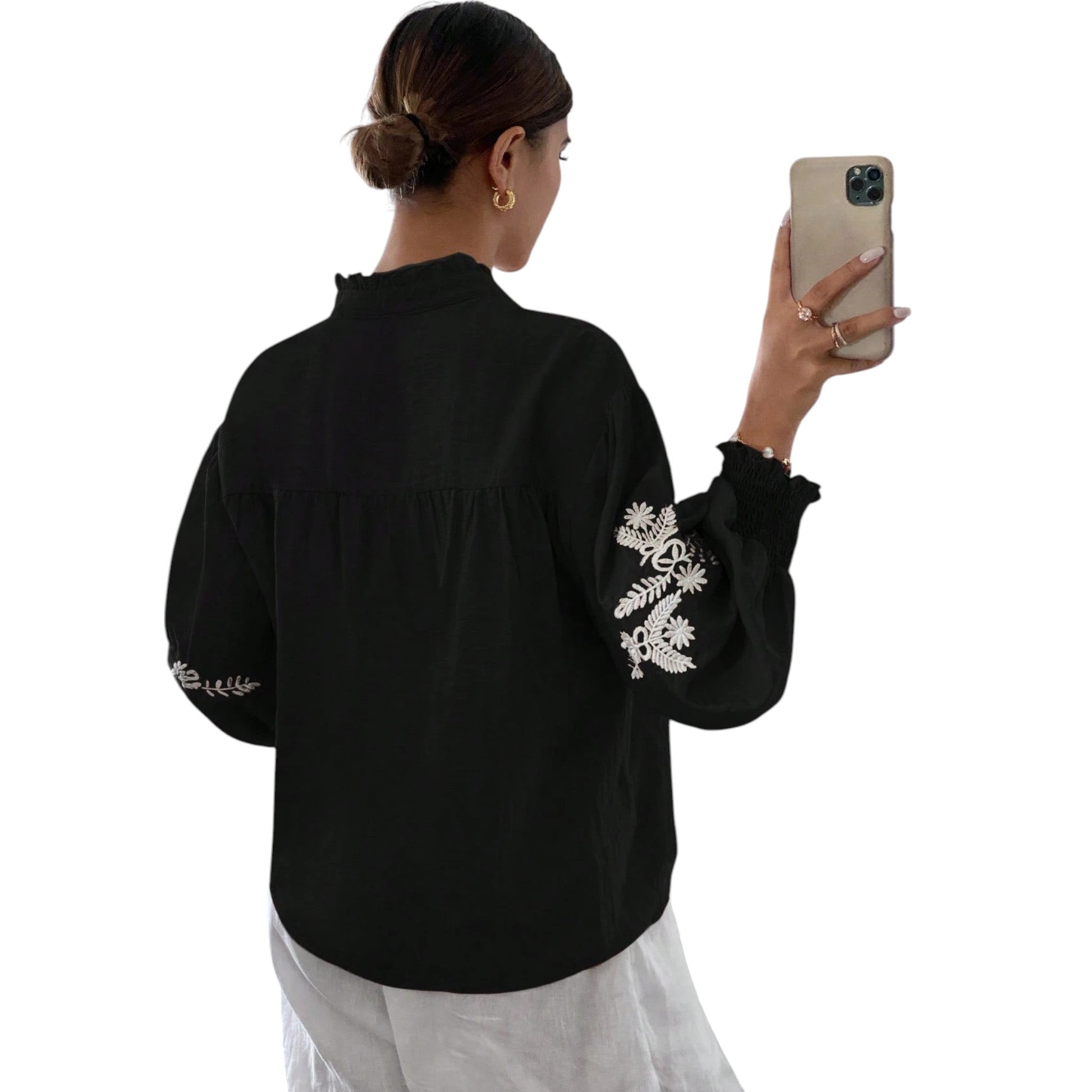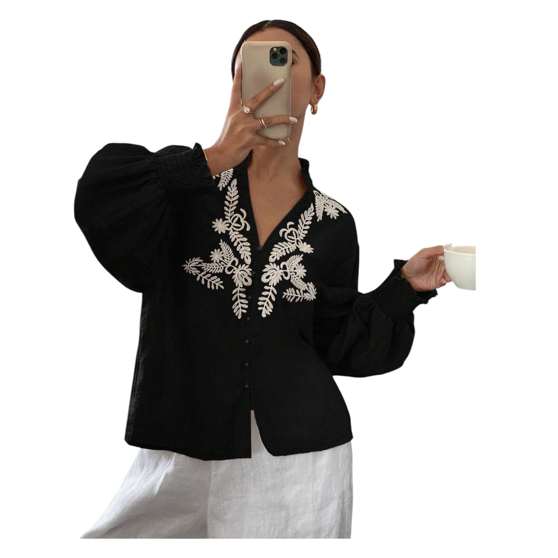 Címke nélküli, fekete, V-nyakú, gombos, bő, hosszú ujjú blúz, fehér hímzéssel az elején.