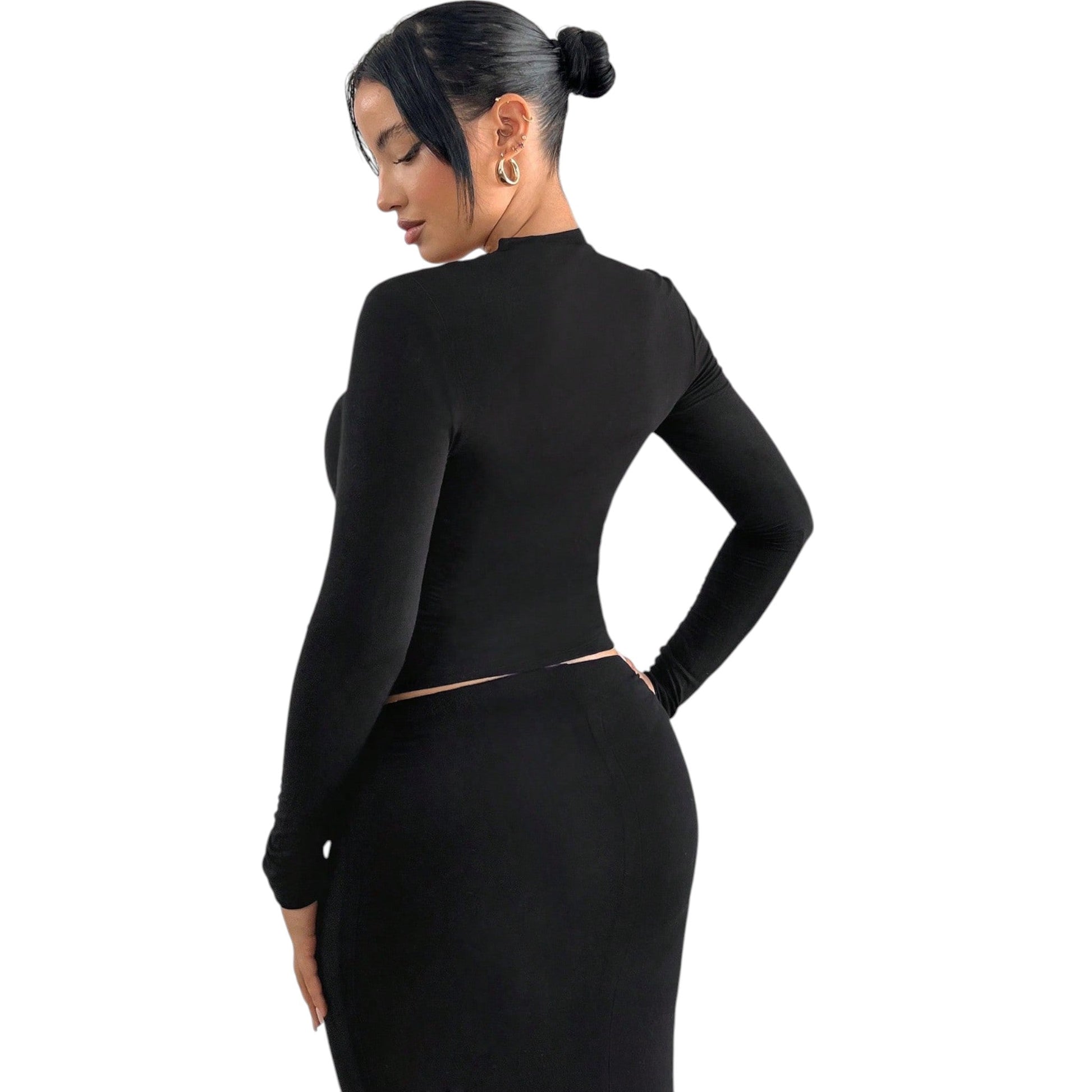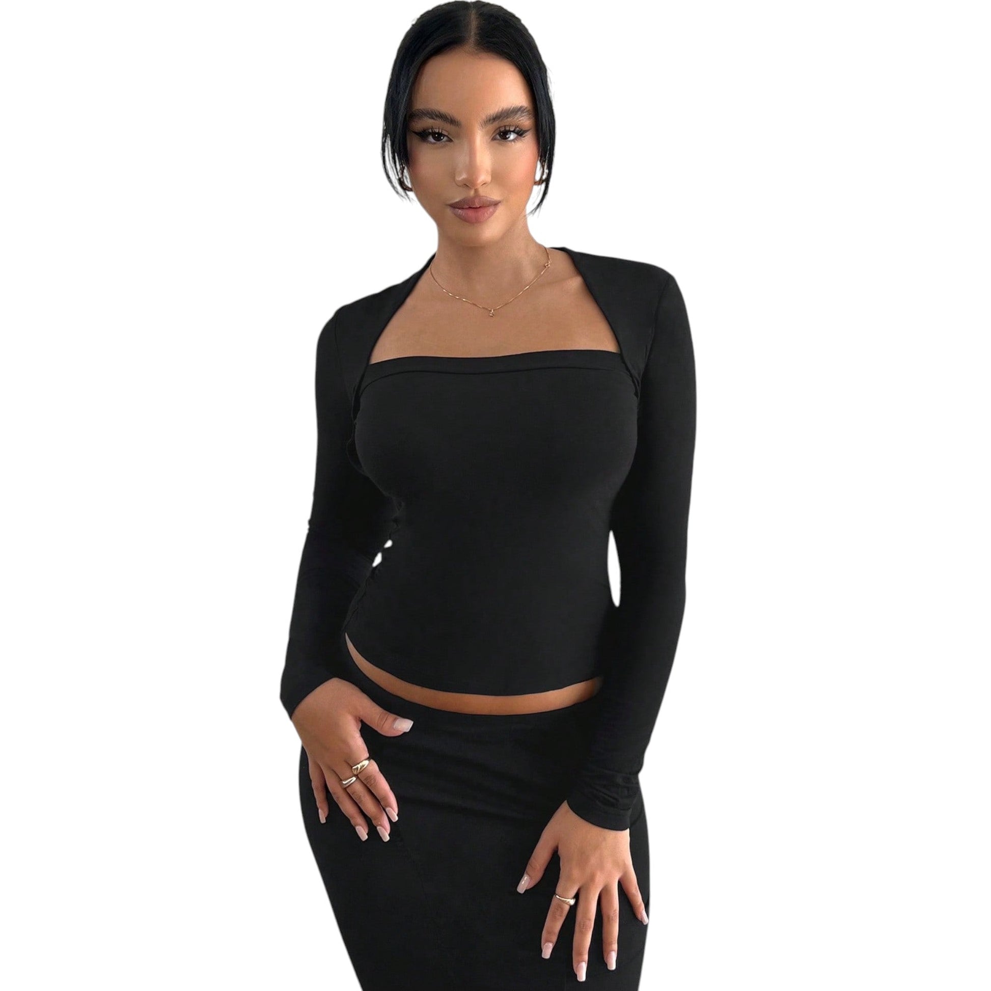 Címke nélküli, fekete, hosszú ujjú, négyzet nyakú crop top.