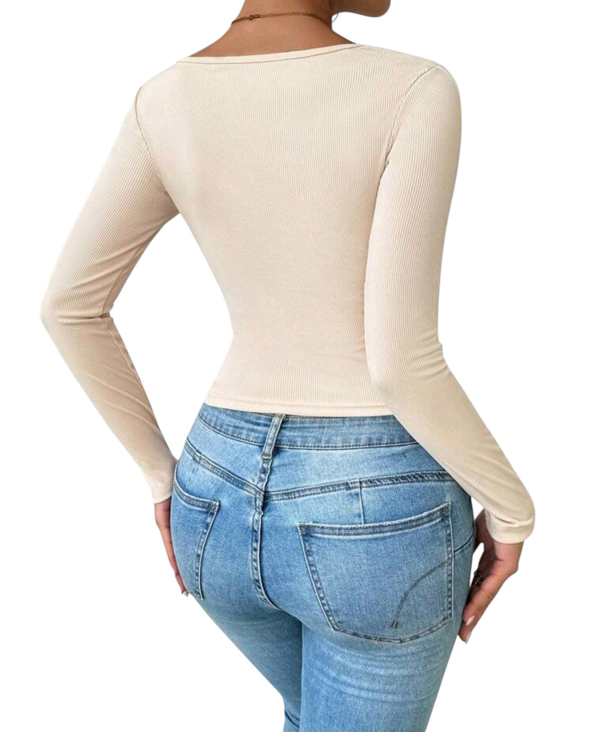 Címke nélküli, bézs, hosszú ujjú, szögletes nyakú, gombos, bordázott, crop top