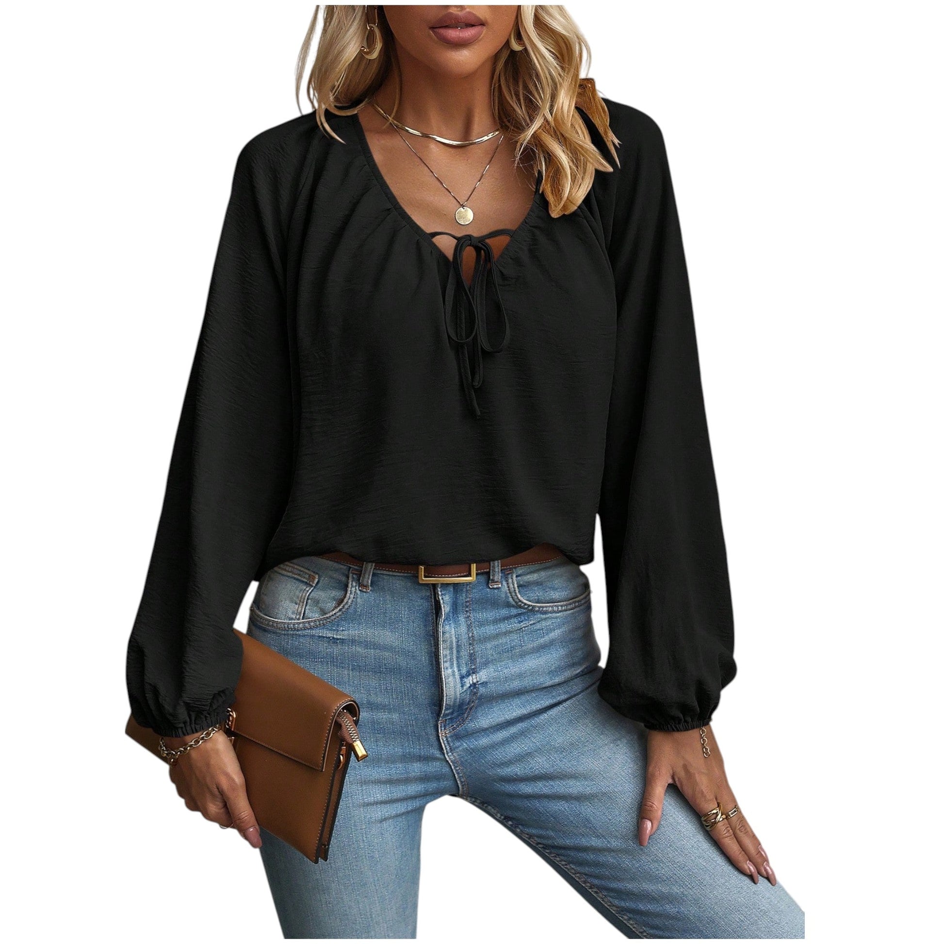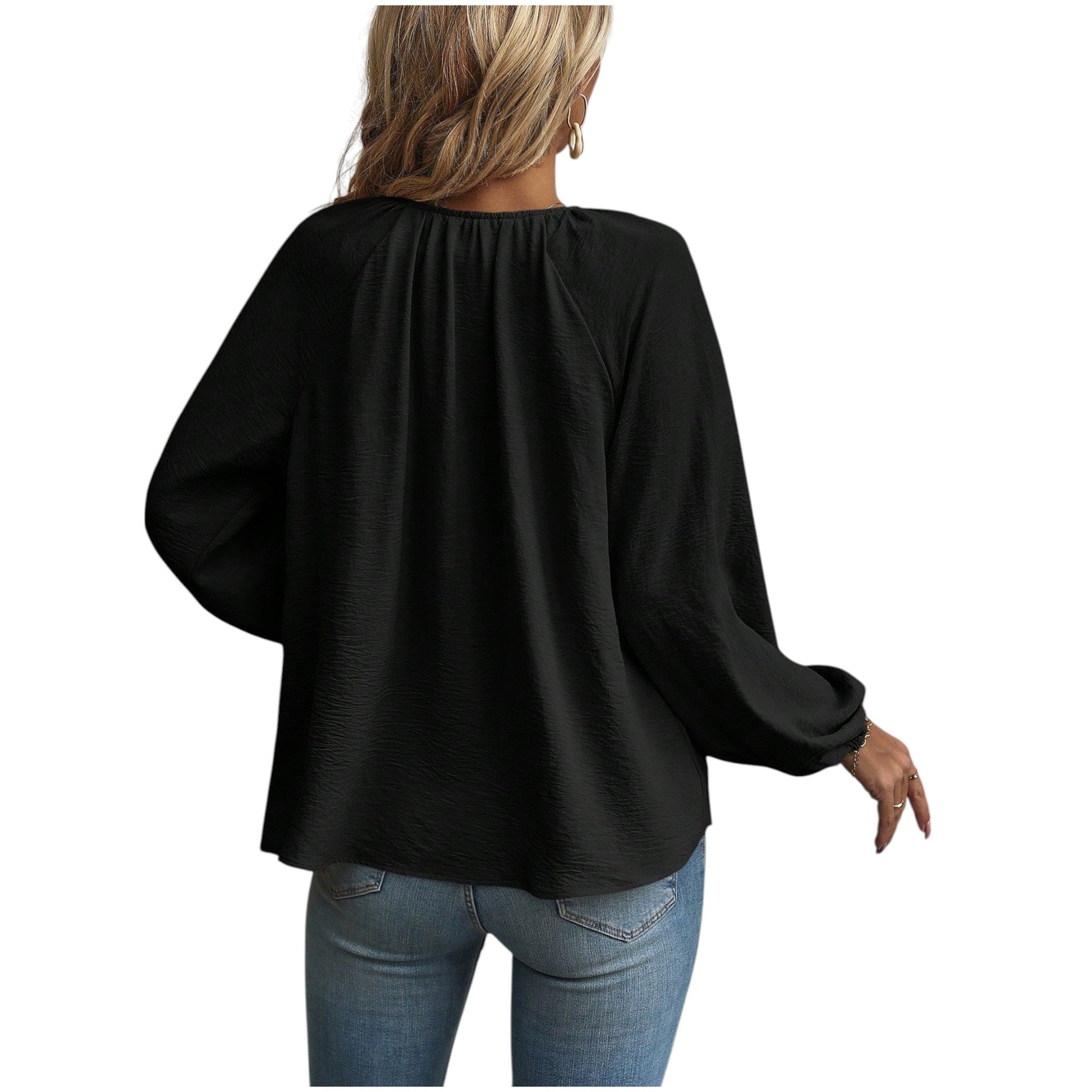 Címke nélküli, fekete, hosszú ujjú, enyhén bő szabású, elöl masnival megkötős, lezser blúz.