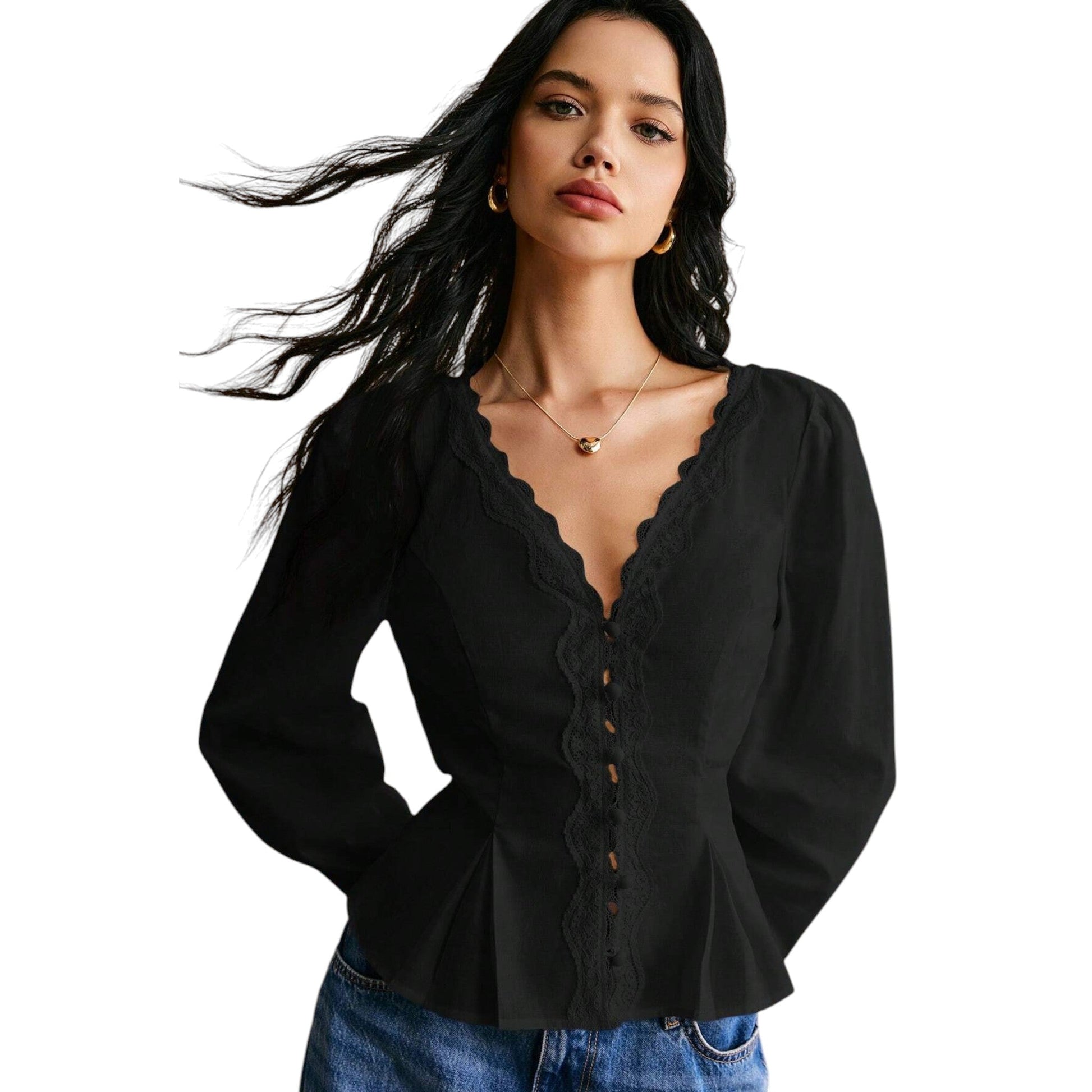 Címke nélküli, fekete, V-nyakú, hosszú ujjú, gombos, csipkés szegélyű, peplum fazonú.