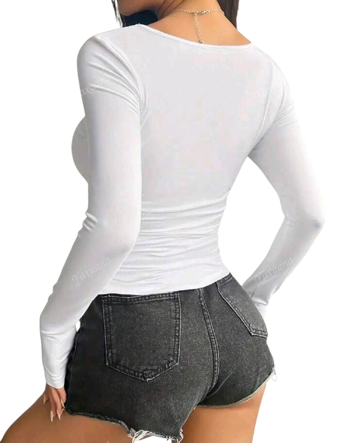 Címke nélküli, fehér, hosszú ujjú, szögletes nyakú, ráncolt, crop top