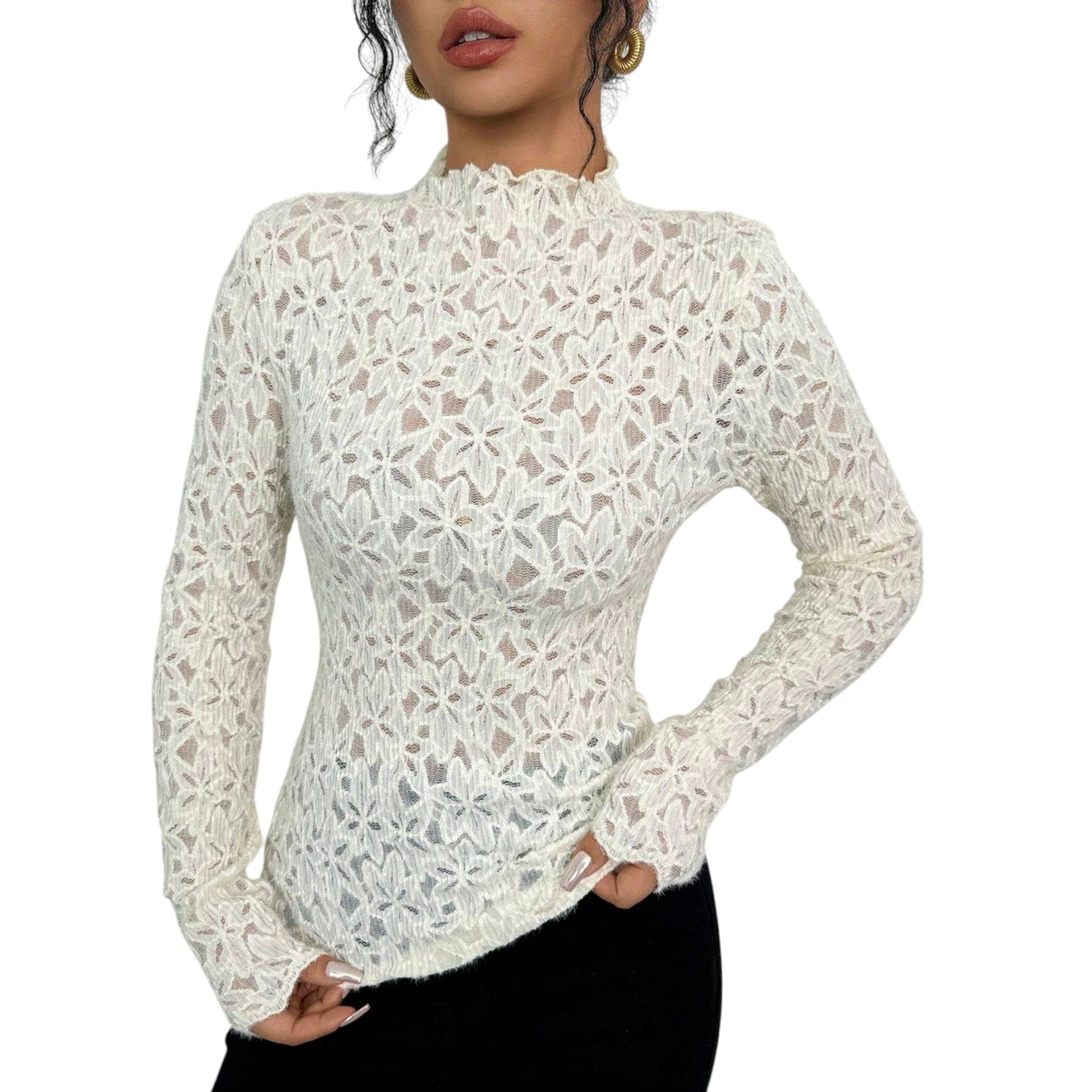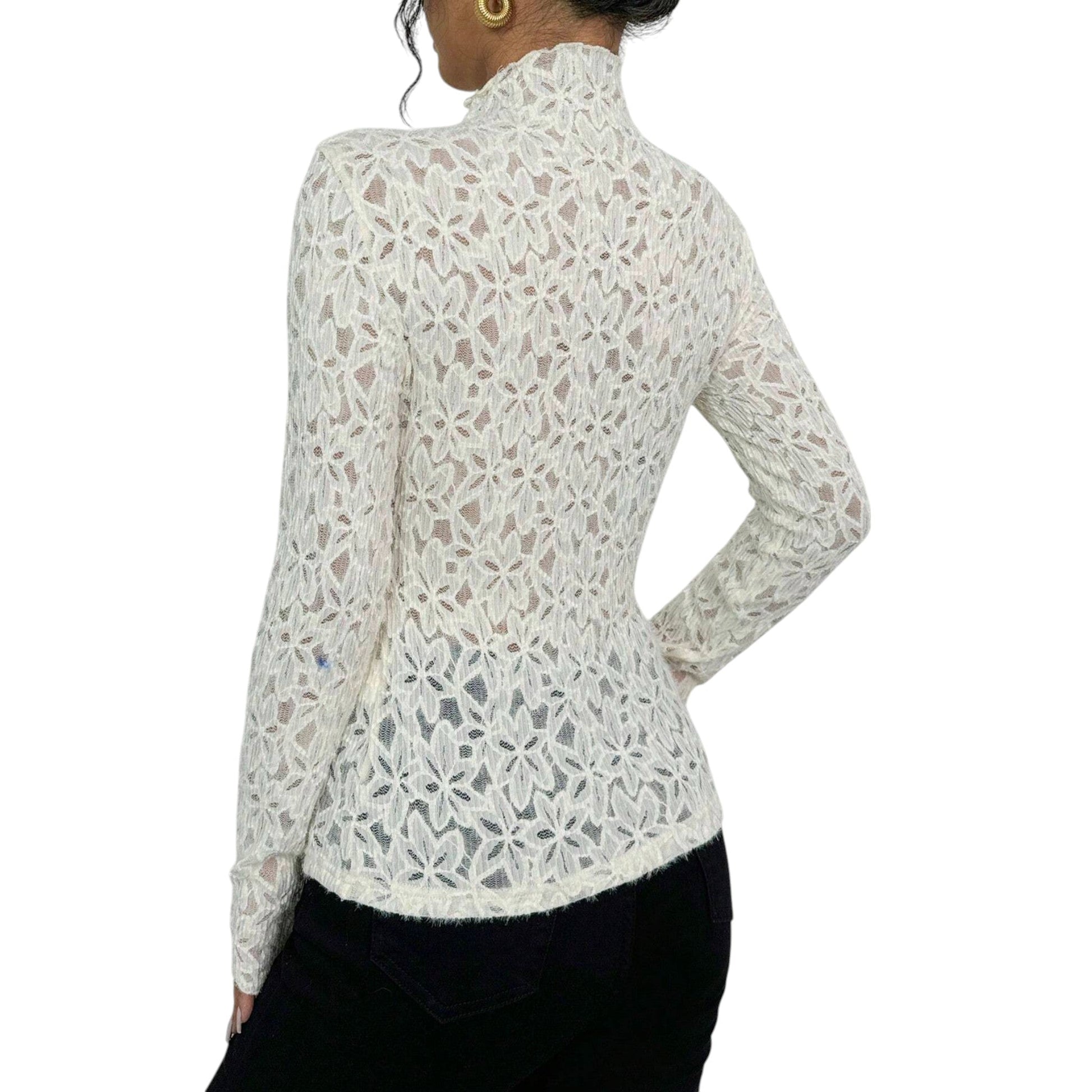 Címke nélküli, fehér, hosszú ujjú, garbó nyakú, csipkés felső.