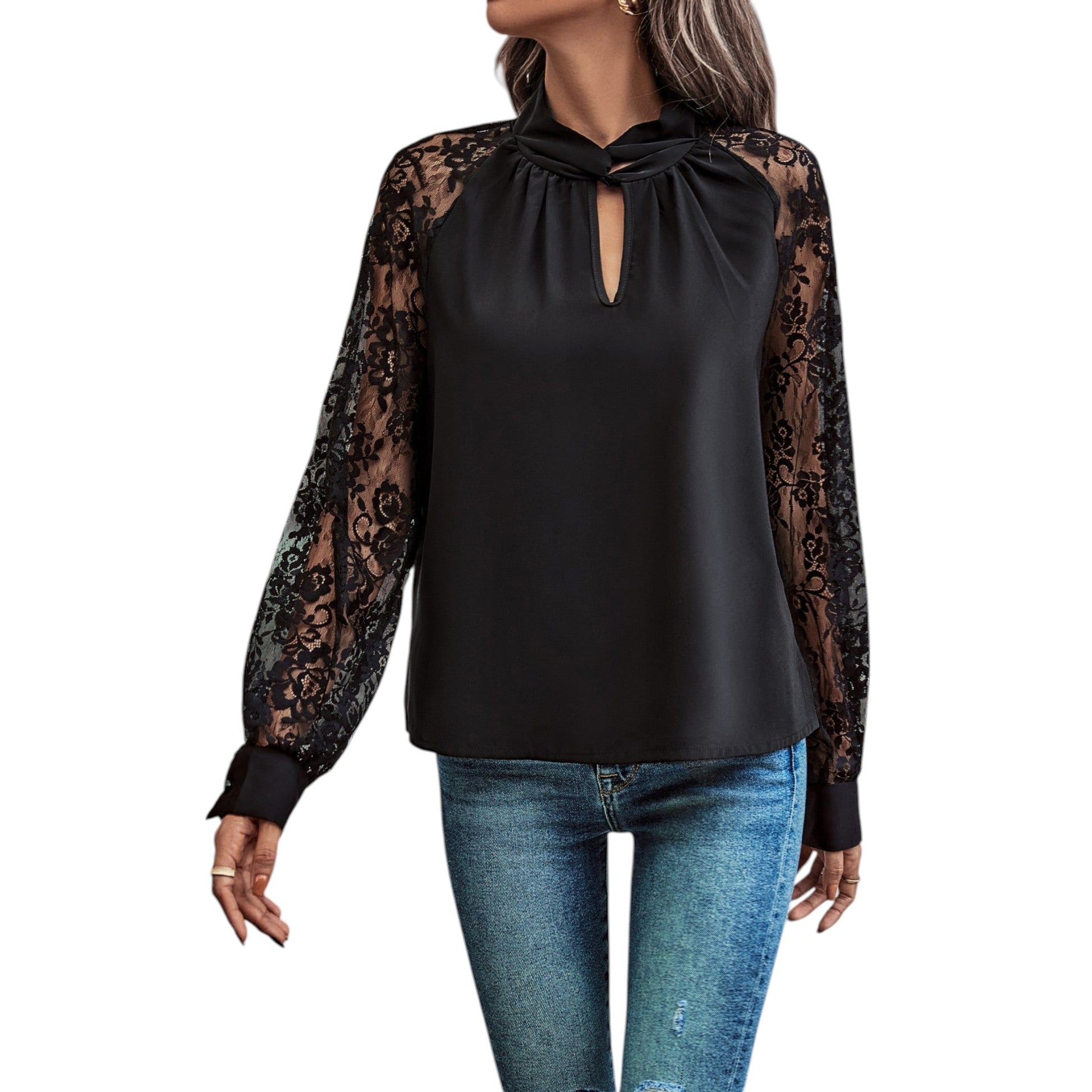 Címke nélküli, fekete, csipkés ujjú, nyakkendős, kulcslyuk kivágású blúz.