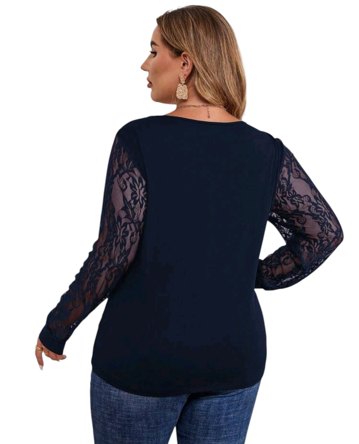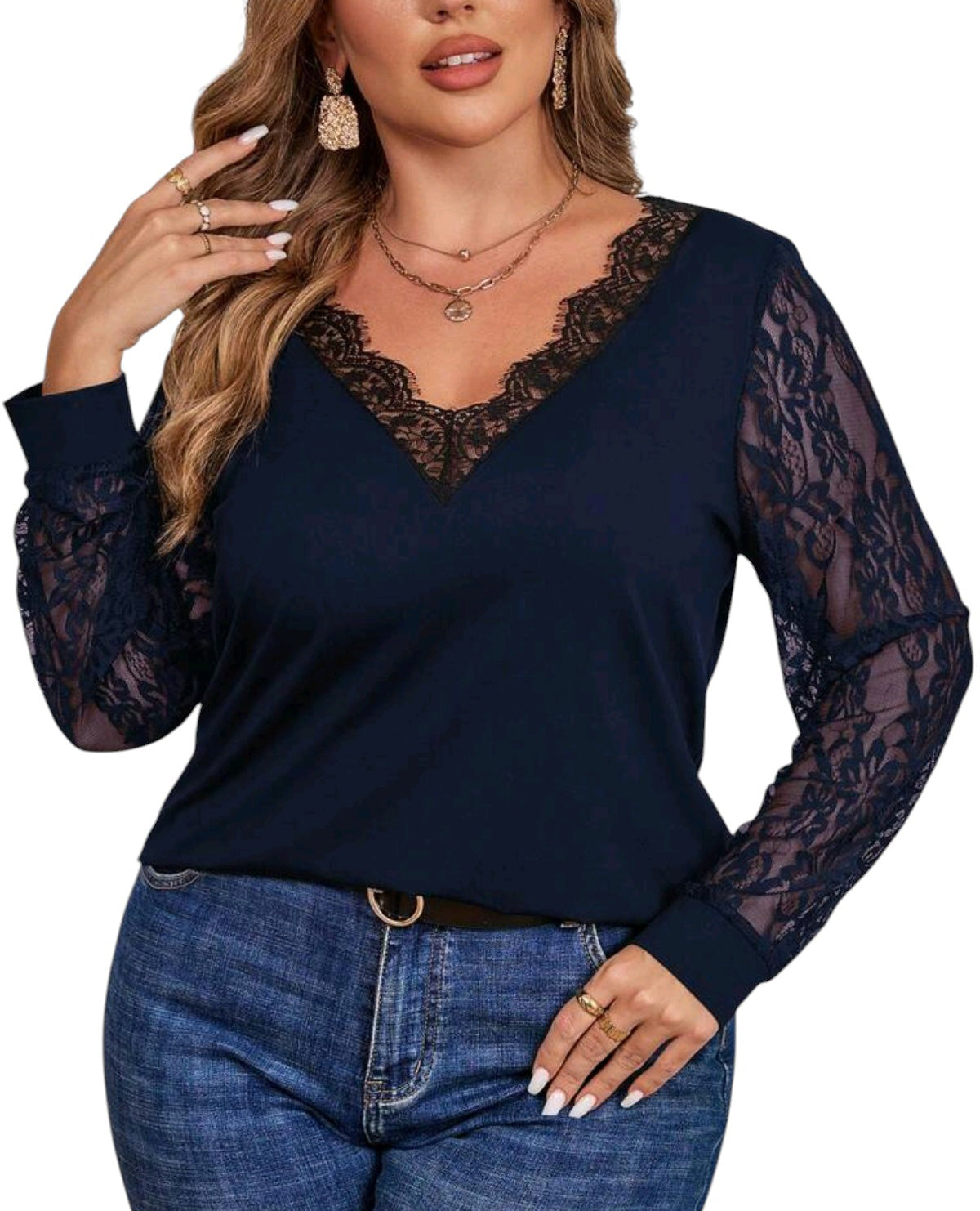 Címke nélküli, sötétkék, hosszú csipkeujjú, V-nyakú, csipke szegélyű felső