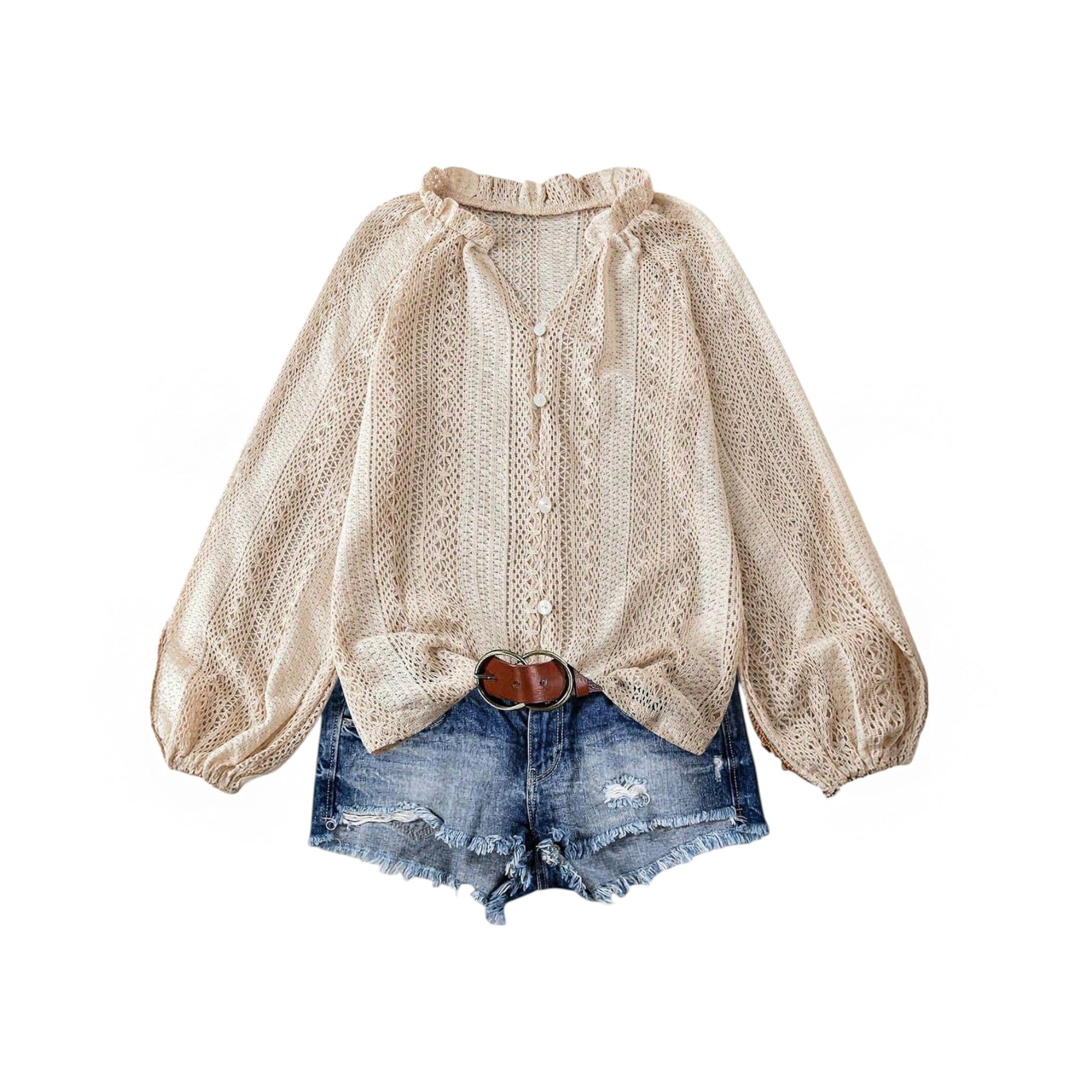 Címke nélküli, bézs, hosszú ujjú, áttetsző, kötött blúz, fodros gallérral és gombos elülső résszel.