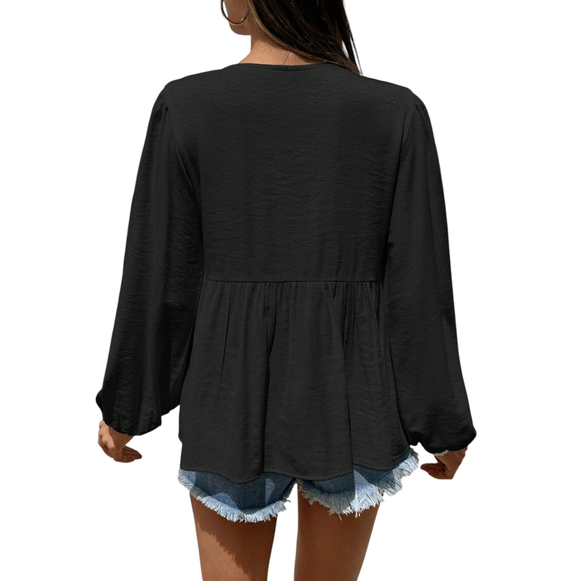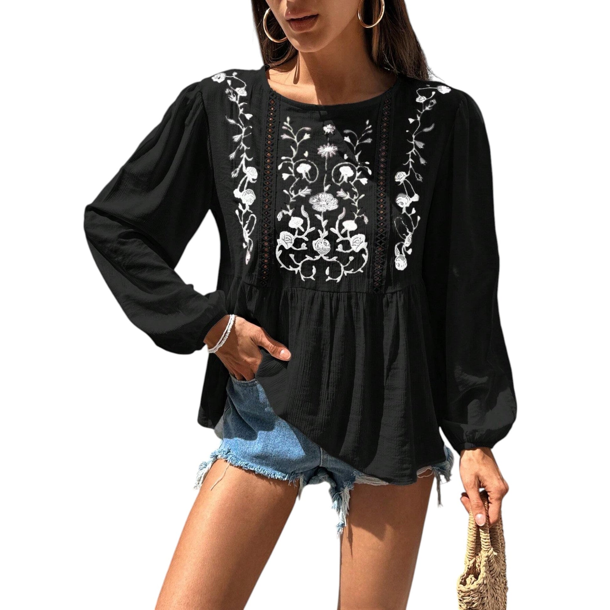 Címke nélküli, fekete, hosszú ujjú, kerek nyakú blúz, fehér virágmintás hímzéssel, ráncolt derékrésszel.