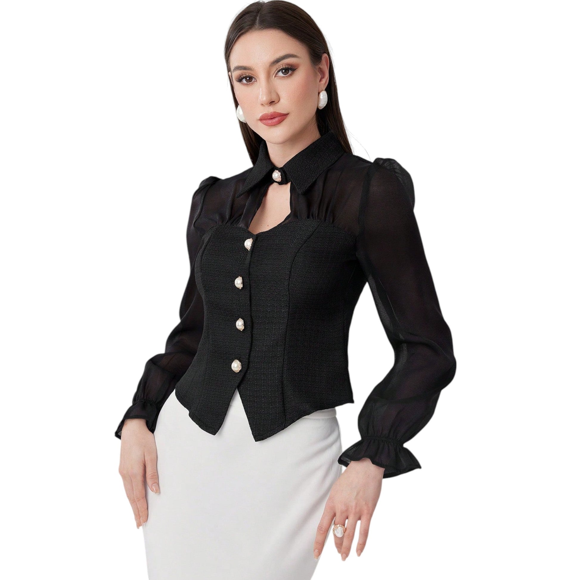 Címke nélküli, fekete, galléros blúz. Hosszú, átlátszó, puffos ujjakkal, mandzsettával és fodros résszel az alján. Elöl gombos, mellrésznél tweed hatású anyaggal, alul enyhén V-alakú kivágással.