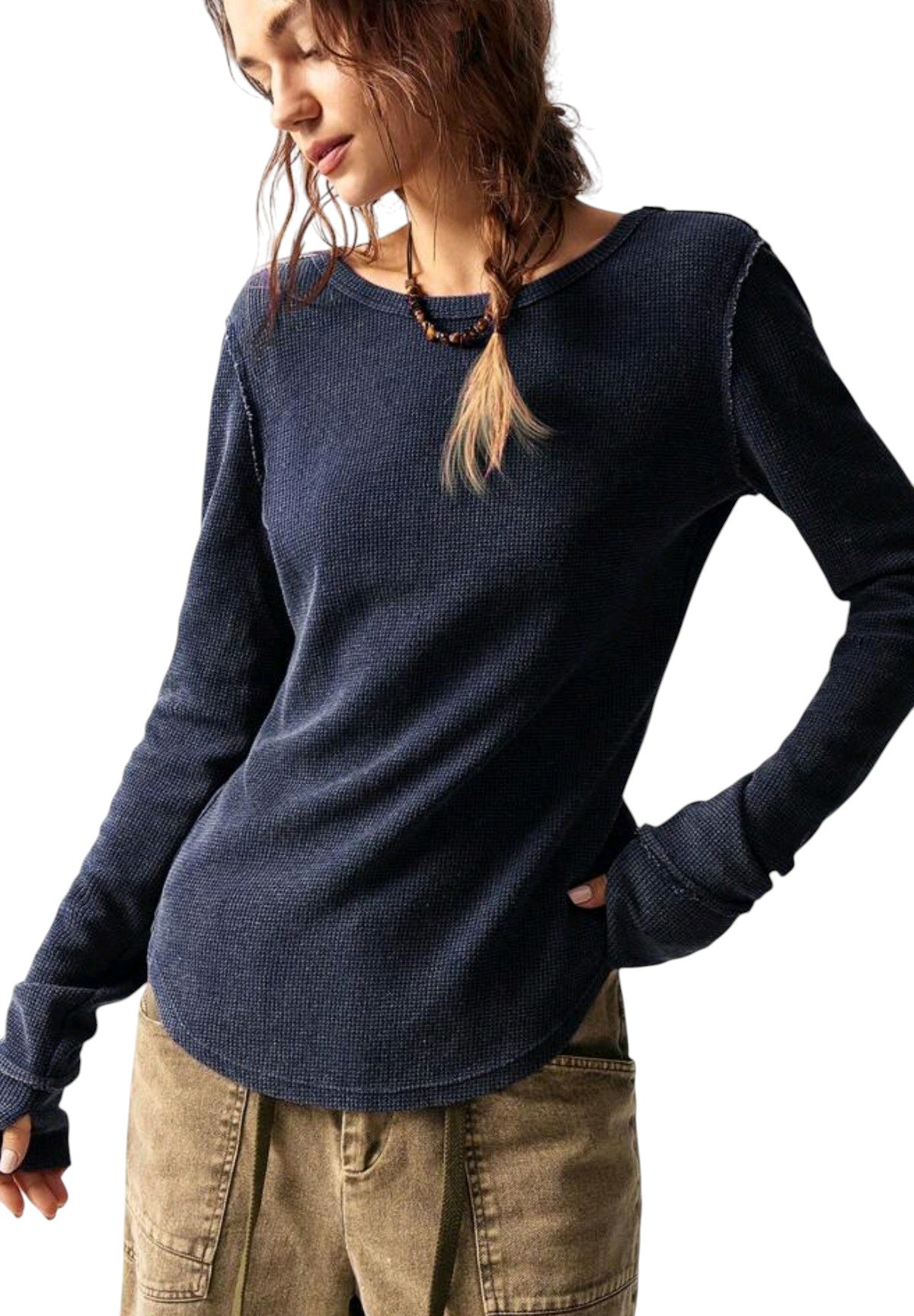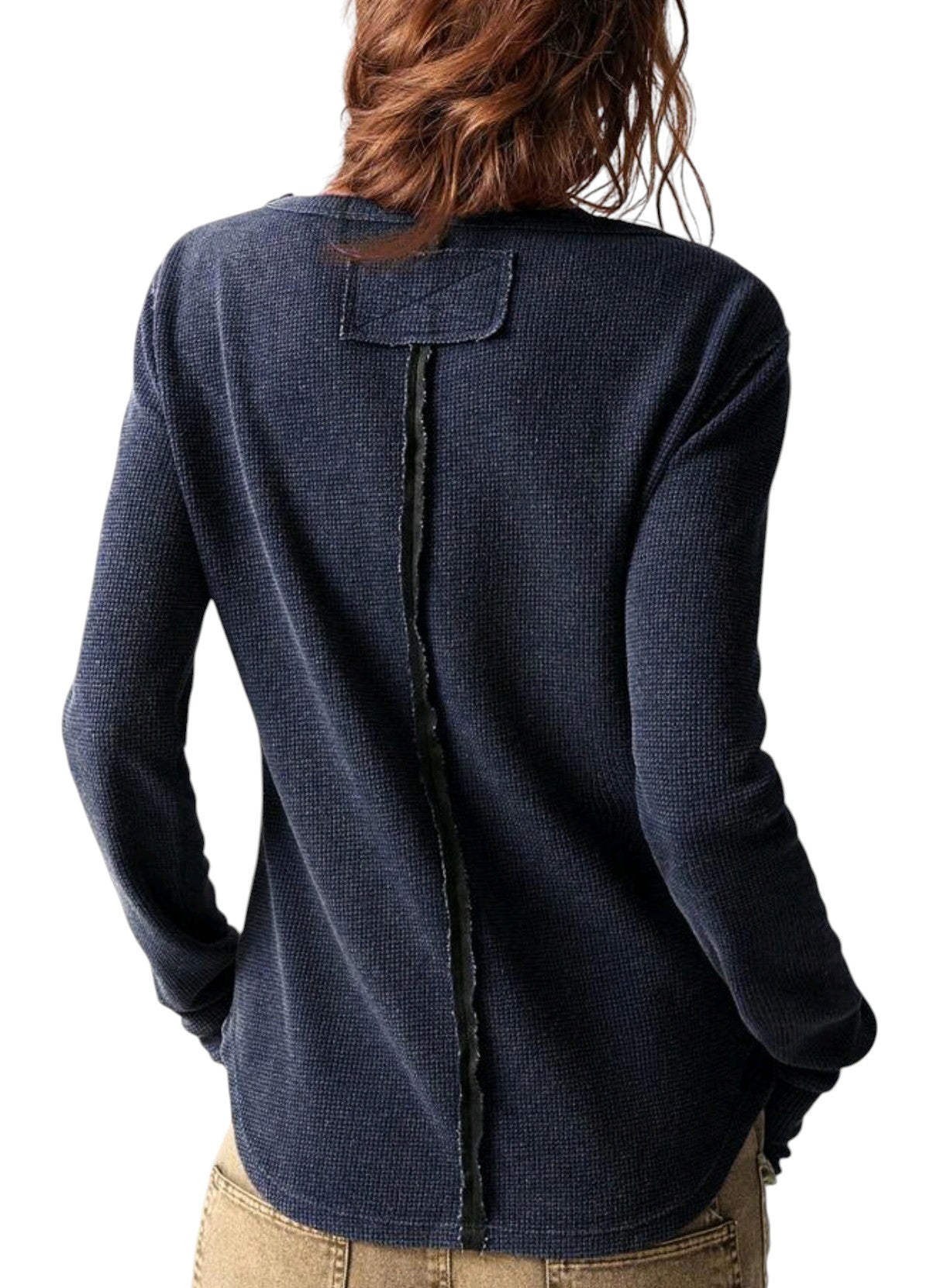 Címke nélküli, sötétkék, hosszú ujjú, kerek nyakú, waffle kötött felső