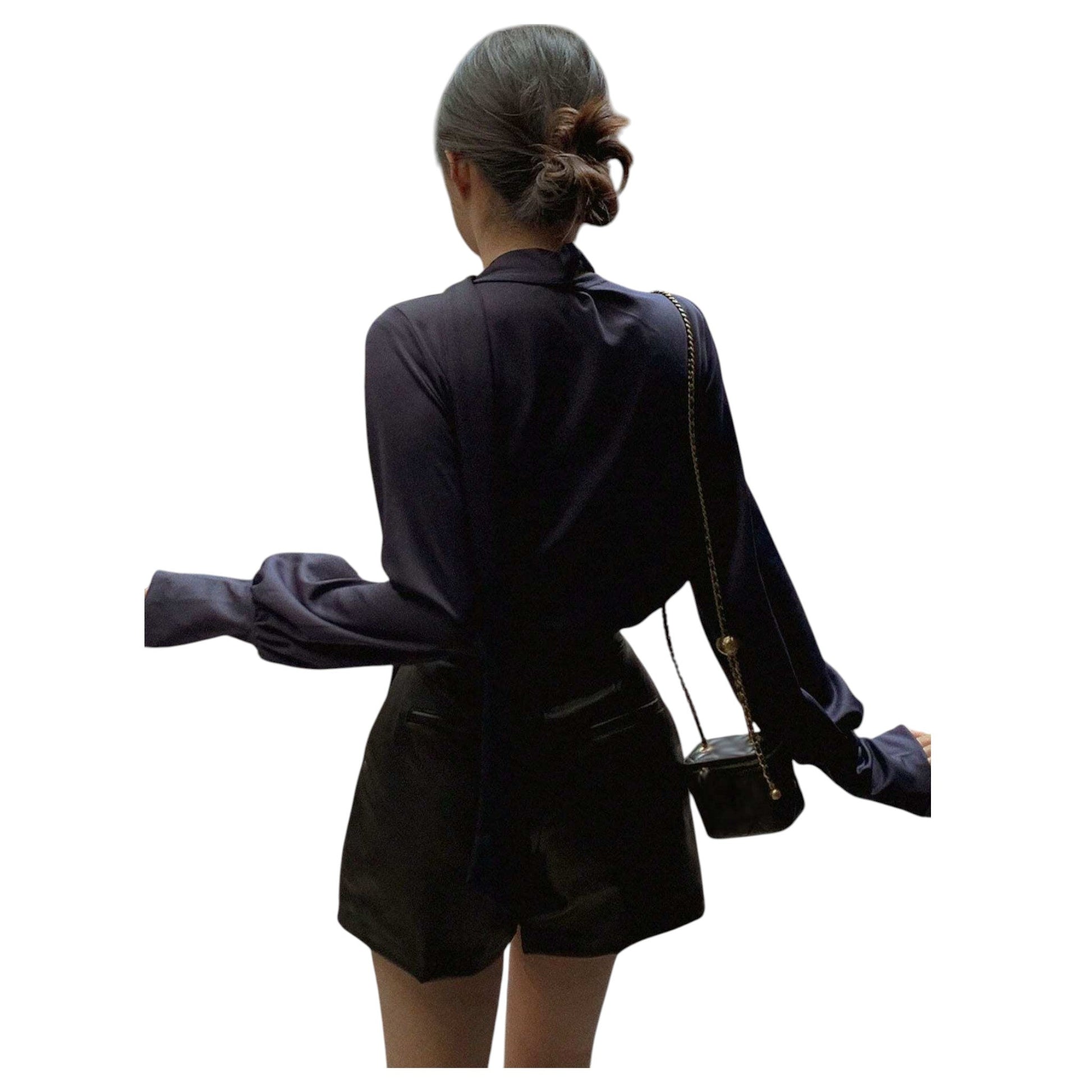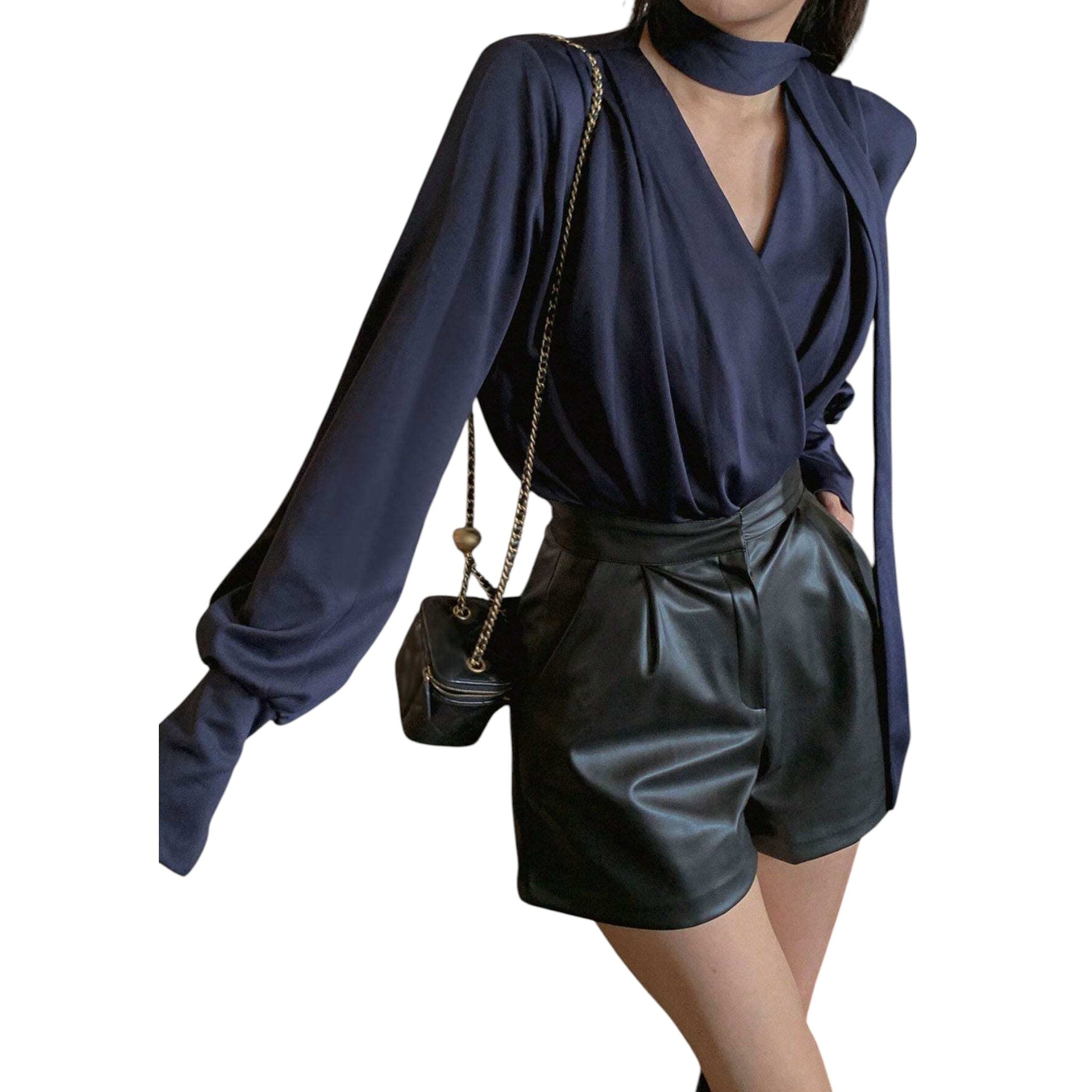 Címke nélküli, sötétkék, hosszú ujjú, V-nyakú, nyaknál megkötős, bő ujjú blúz.