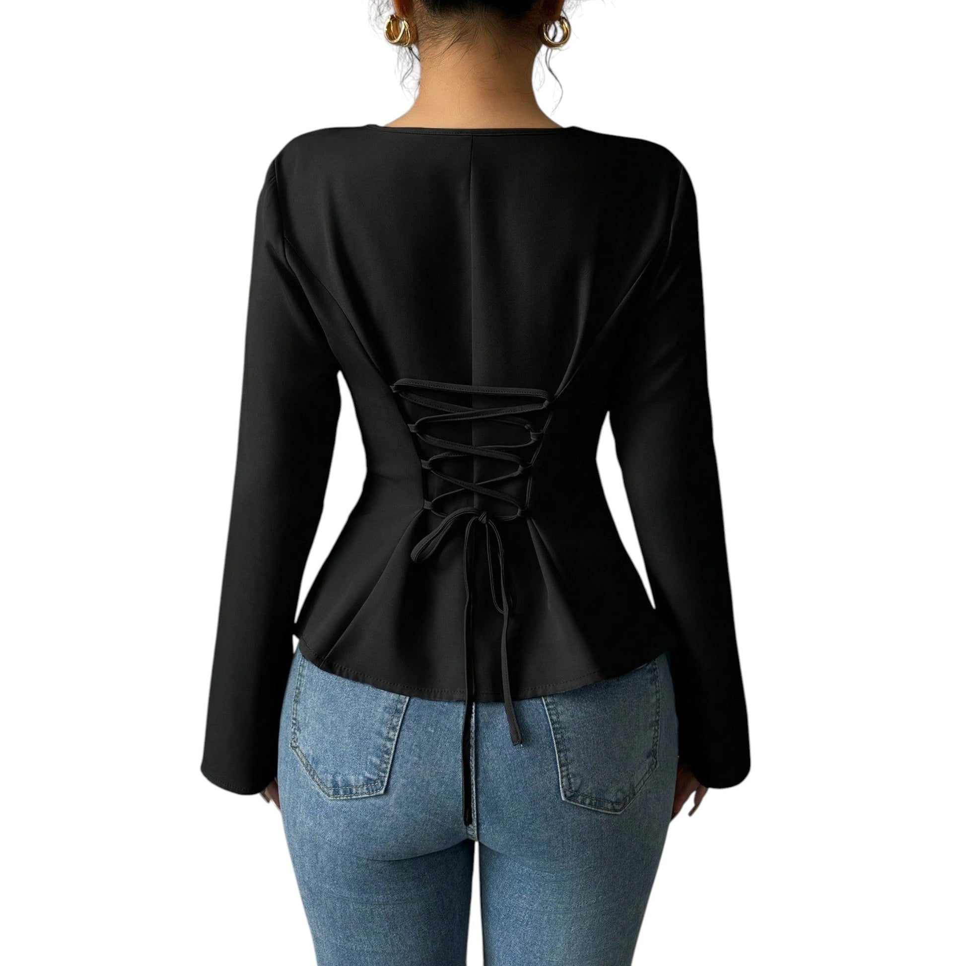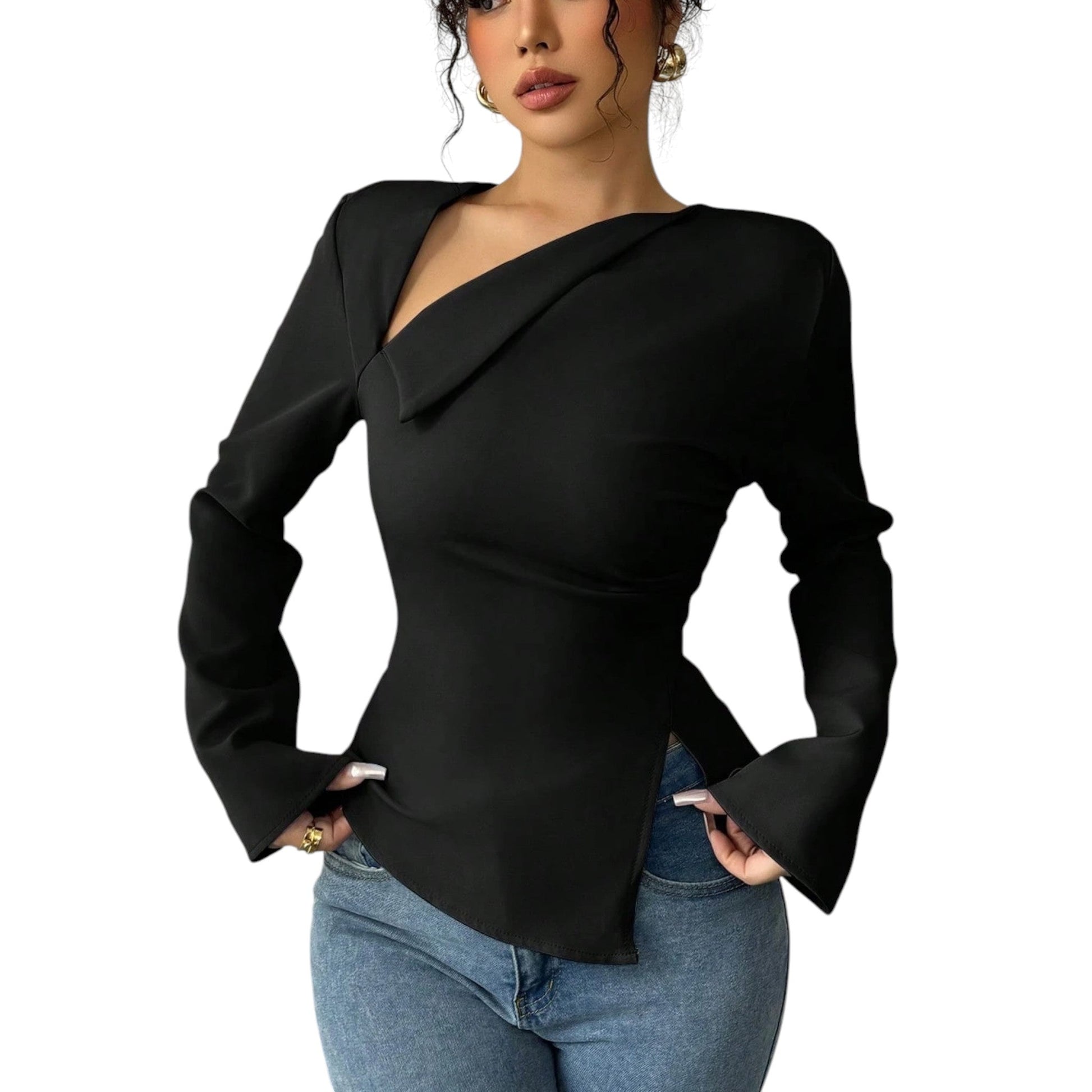 Címke nélküli, fekete, asszimetrikus nyakkivágású, hosszú ujjú felső, alján oldalt sliccelt.