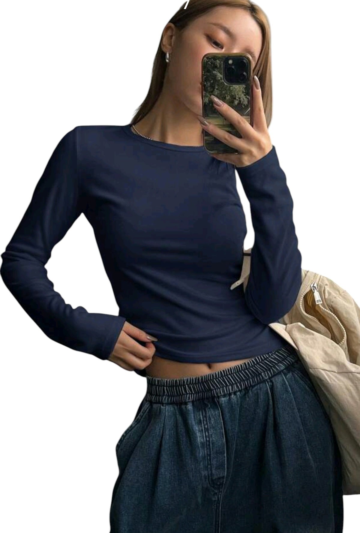 Címke nélküli, sötétkék, hosszú ujjú, kerek nyakú, crop fazonú felső