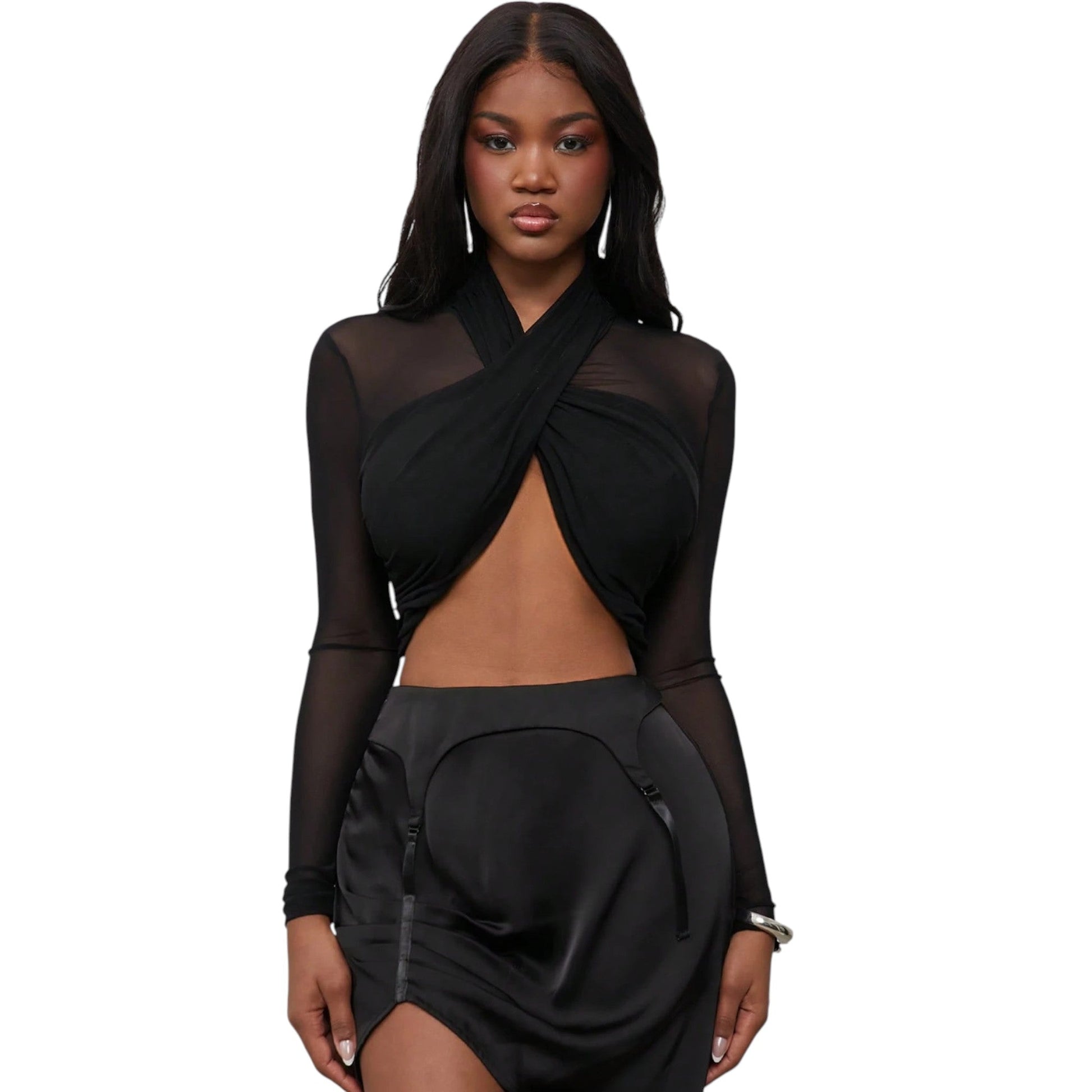 SHE fekete átlapolt hosszú ujjú crop top