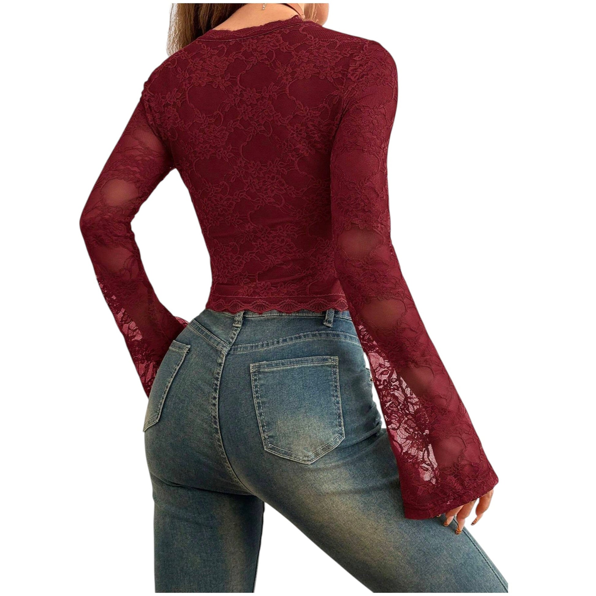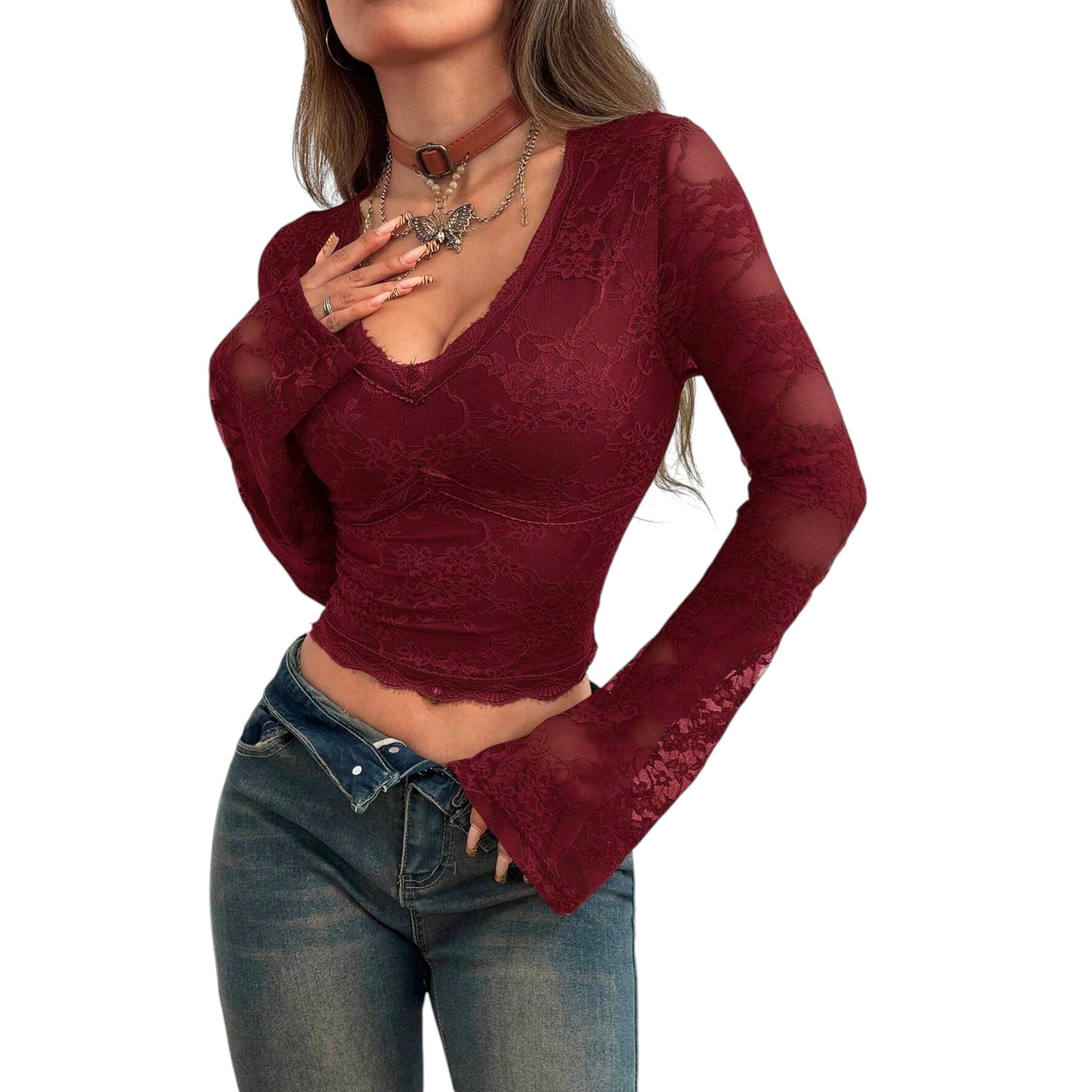 Címke nélküli, bordó, csipke, hosszú, harang ujjú, V-nyakú, testhezálló felső.