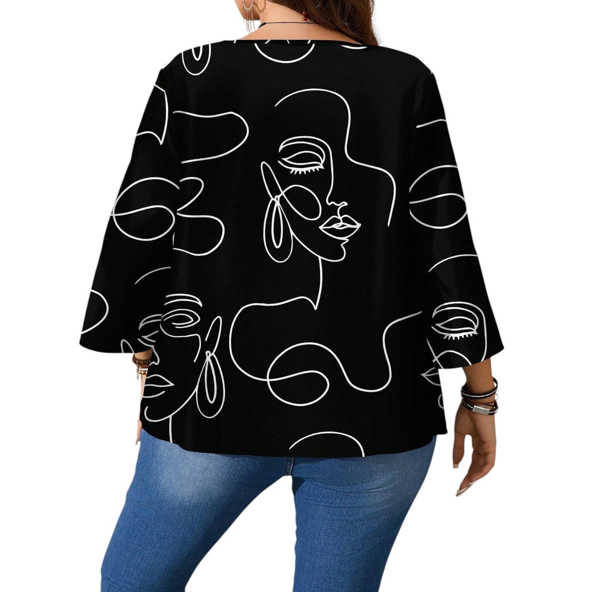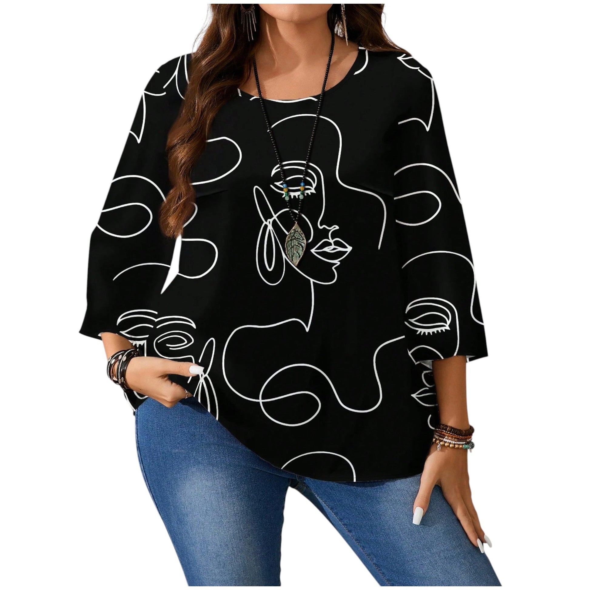 Címke nélküli, fekete alapon fehér absztrakt vonalas mintás, kerek nyakú, háromnegyedes ujjú, bő szabású.