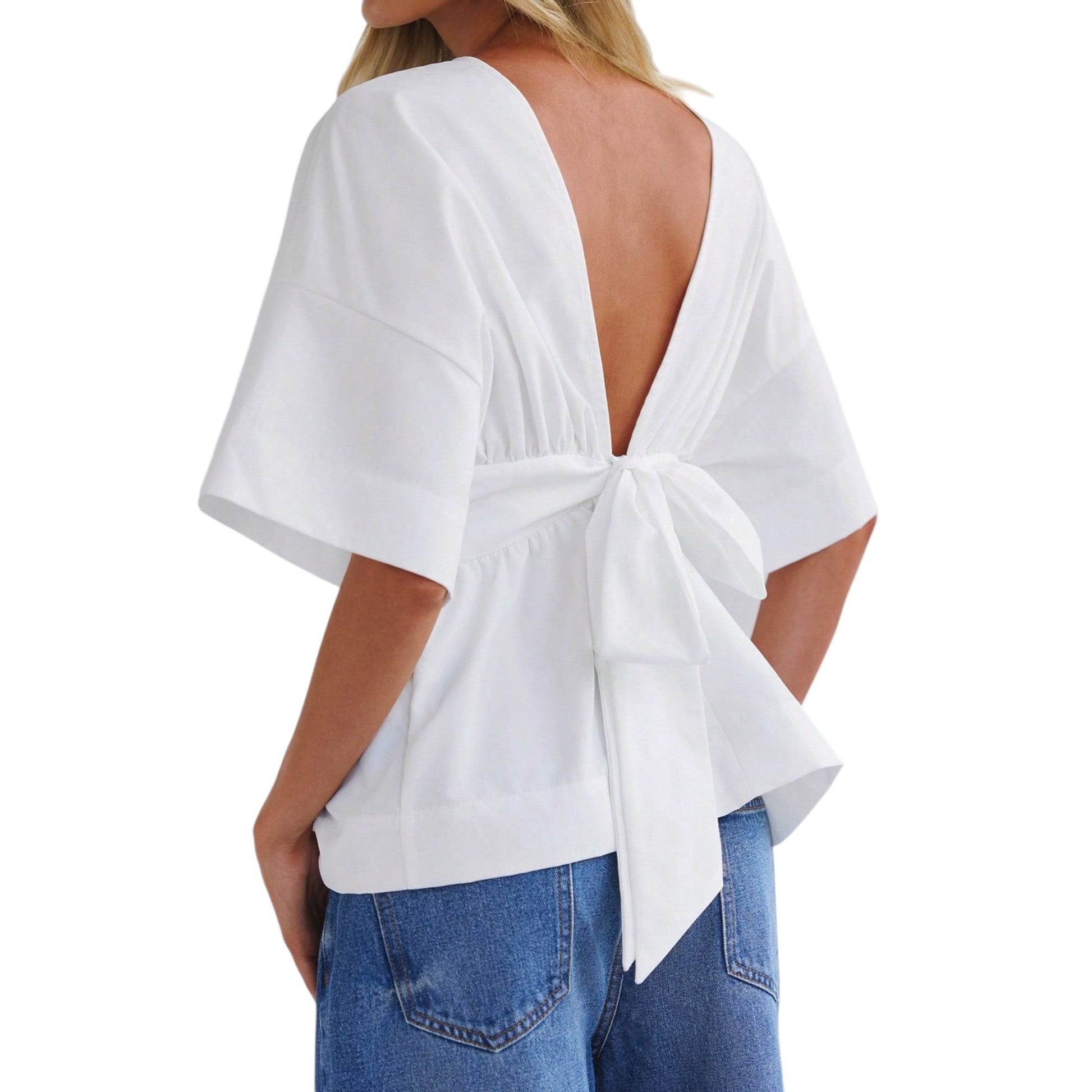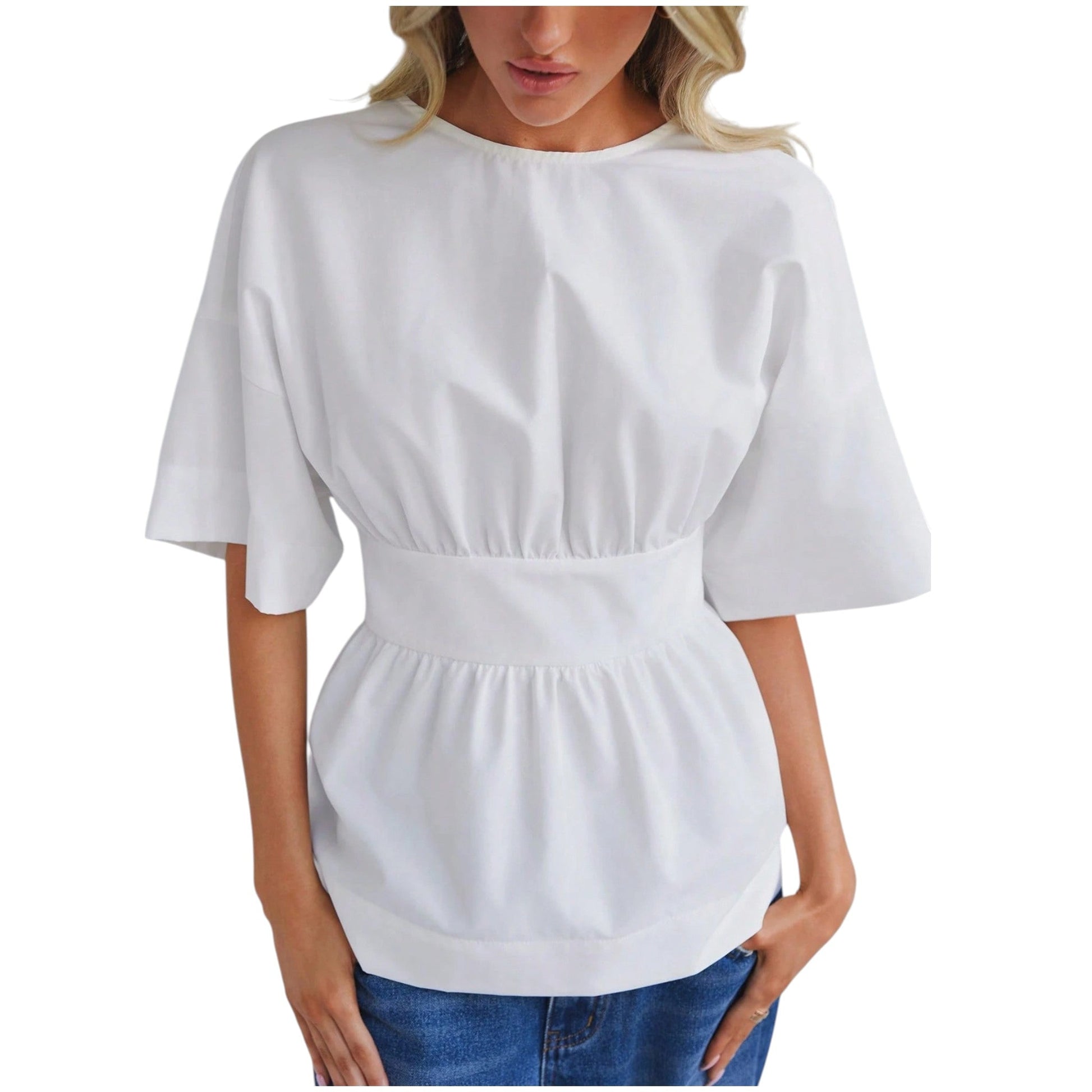 Címke nélküli, ekrü, kerek nyakú, rövid, bő ujjú, derekán gumírozott, húzott részlettel.