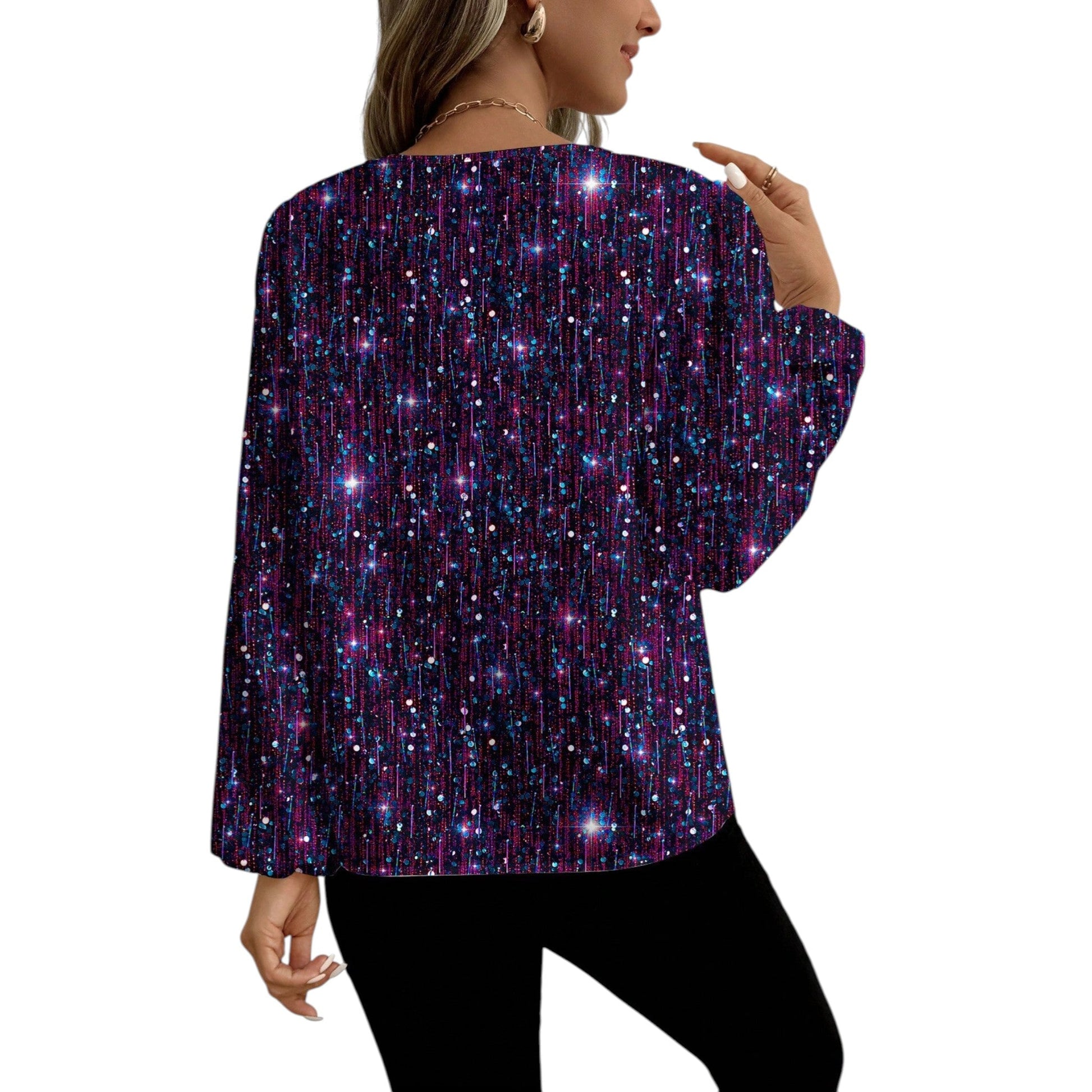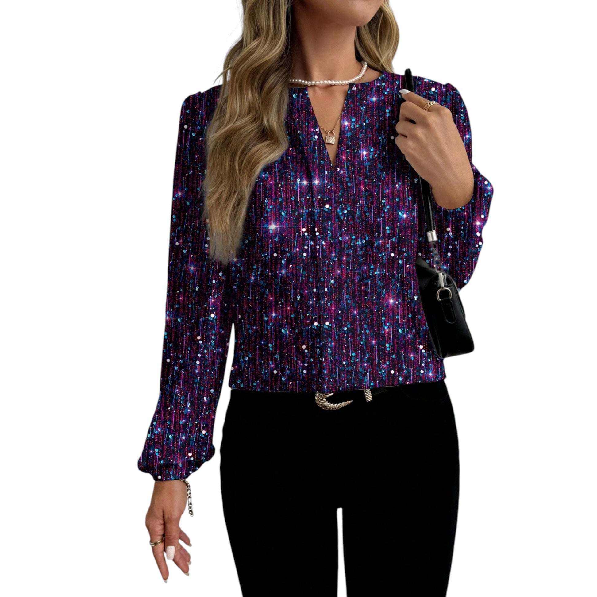Címke nélküli, sötétkék alapon többszínű, csillogó, v-nyakú, hosszú ujjú.