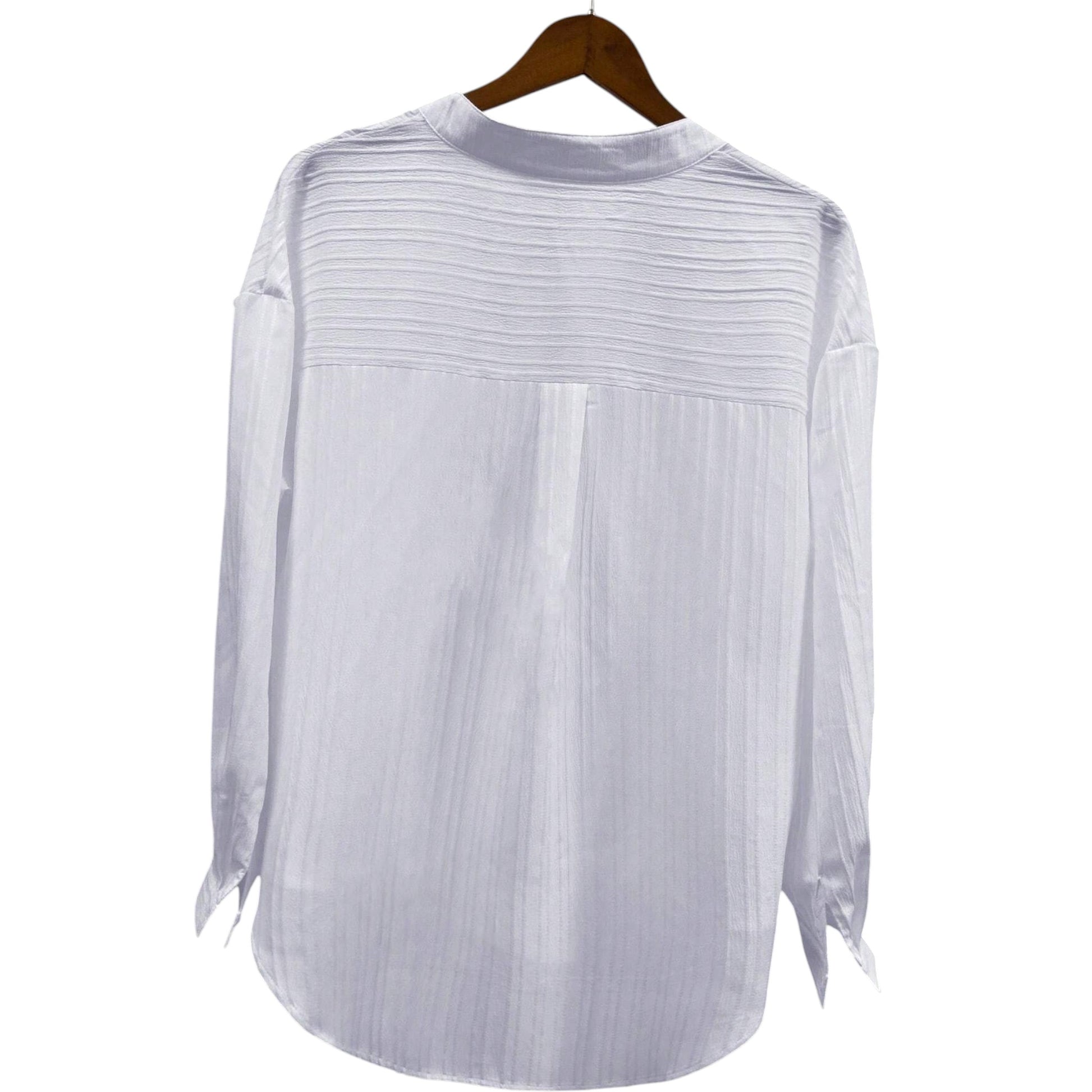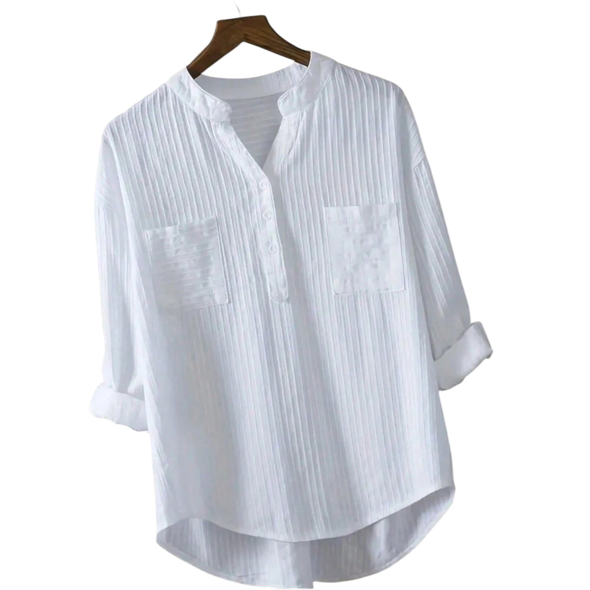 Címke nélküli, ekrü, hosszú ujjú, galléros blúz, gombos nyakkal, mellkasán két zsebbel.