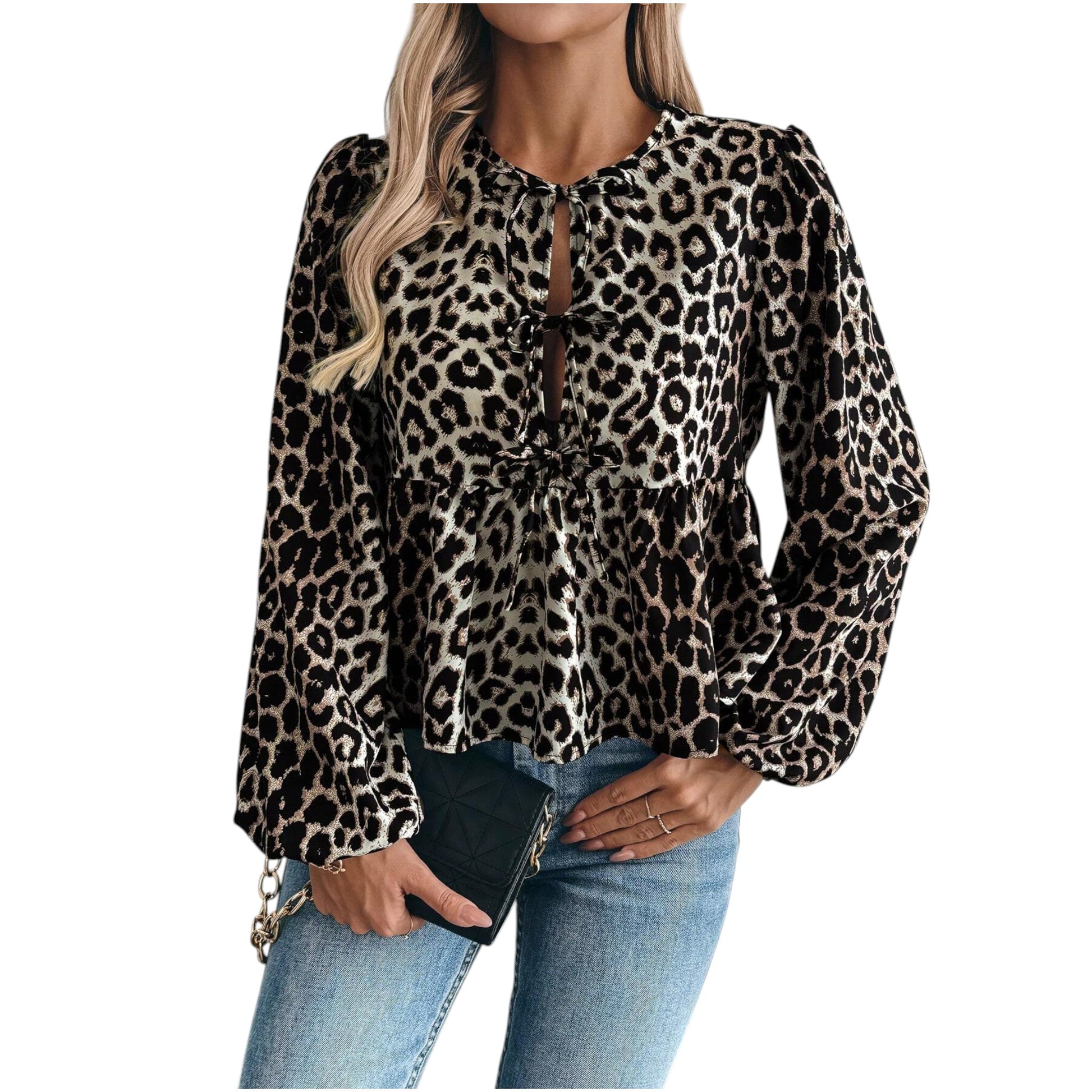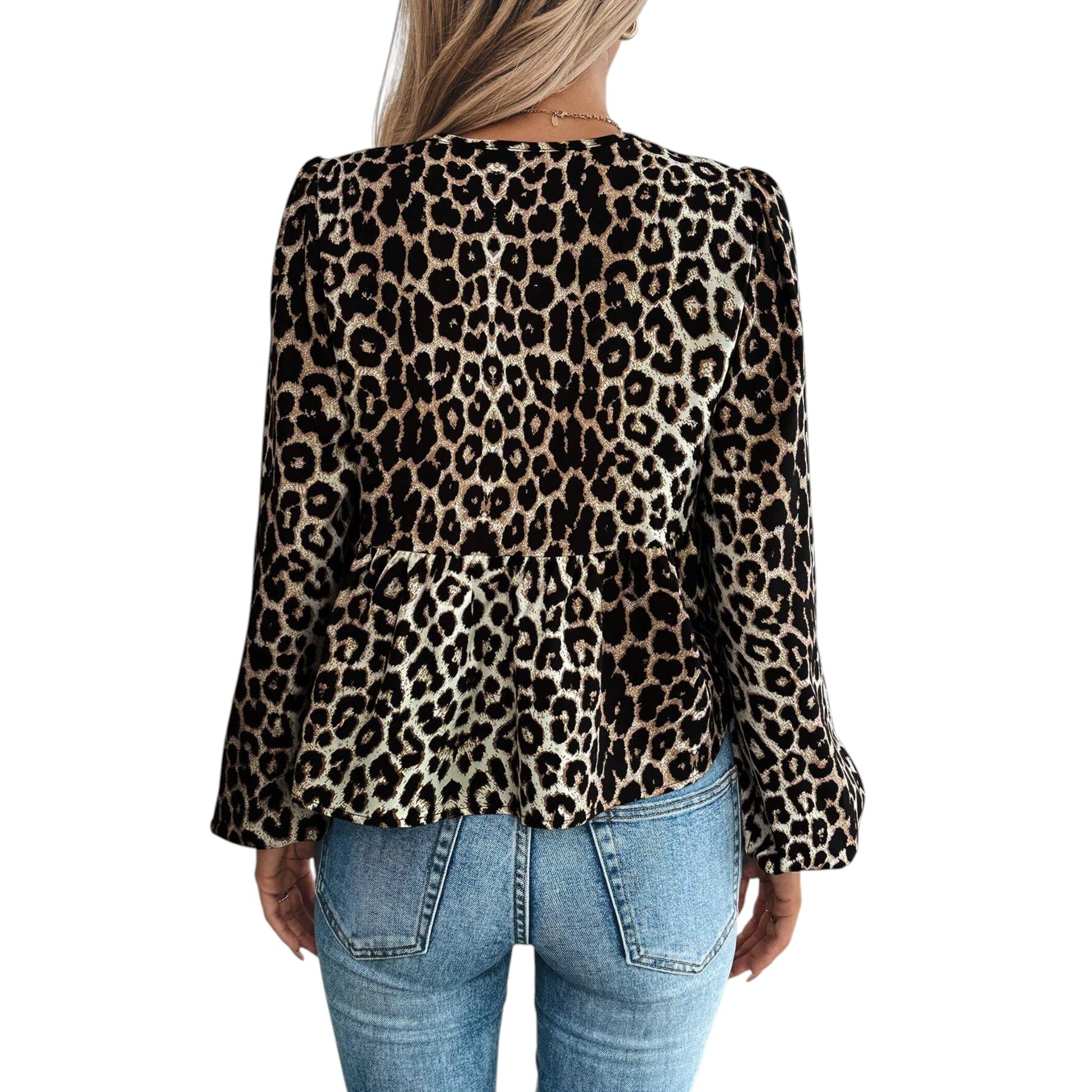 Címke nélküli, leopárd mintás, hosszú, puffos ujjú, nyakánál megkötős, mell alatt húzott, peplum blúz.