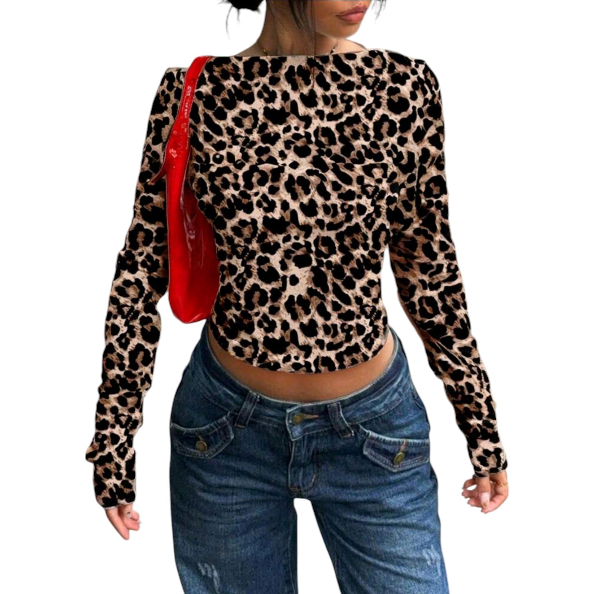 Címke nélküli, leopárdmintás, kerek nyakú, hosszú ujjú crop top