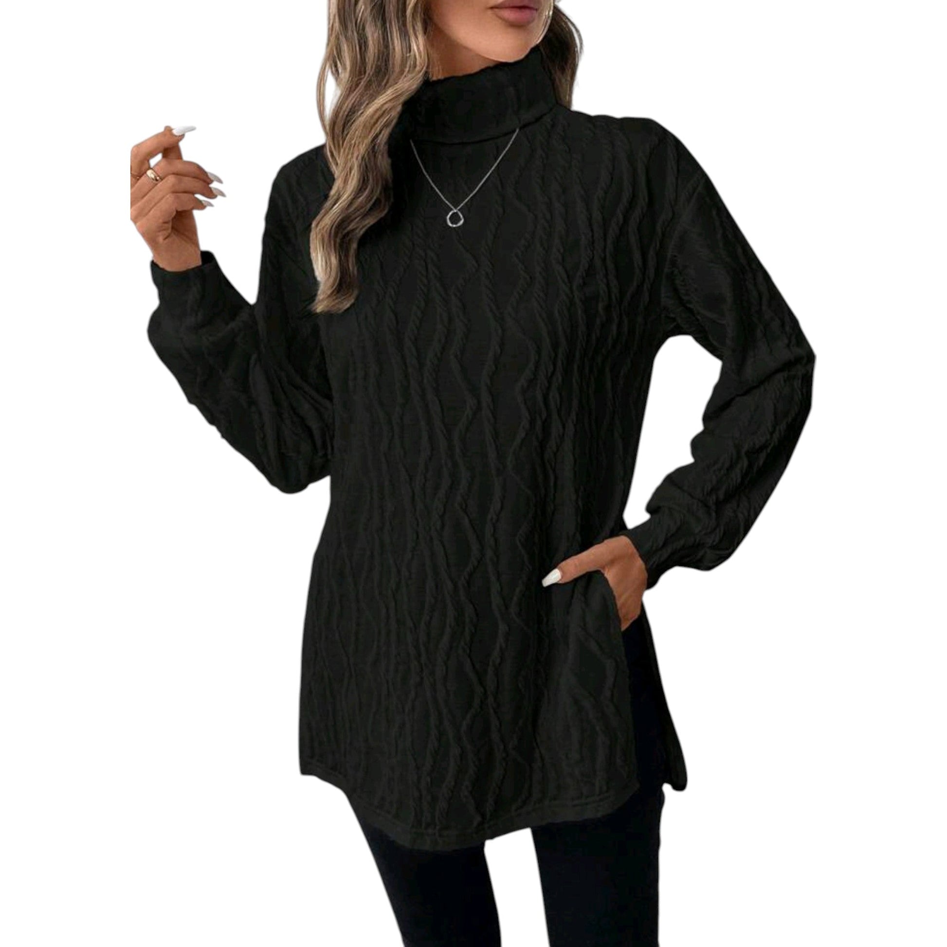 Címke nélküli, fekete, garbós nyakú, hosszú ujjú, kötött blúz