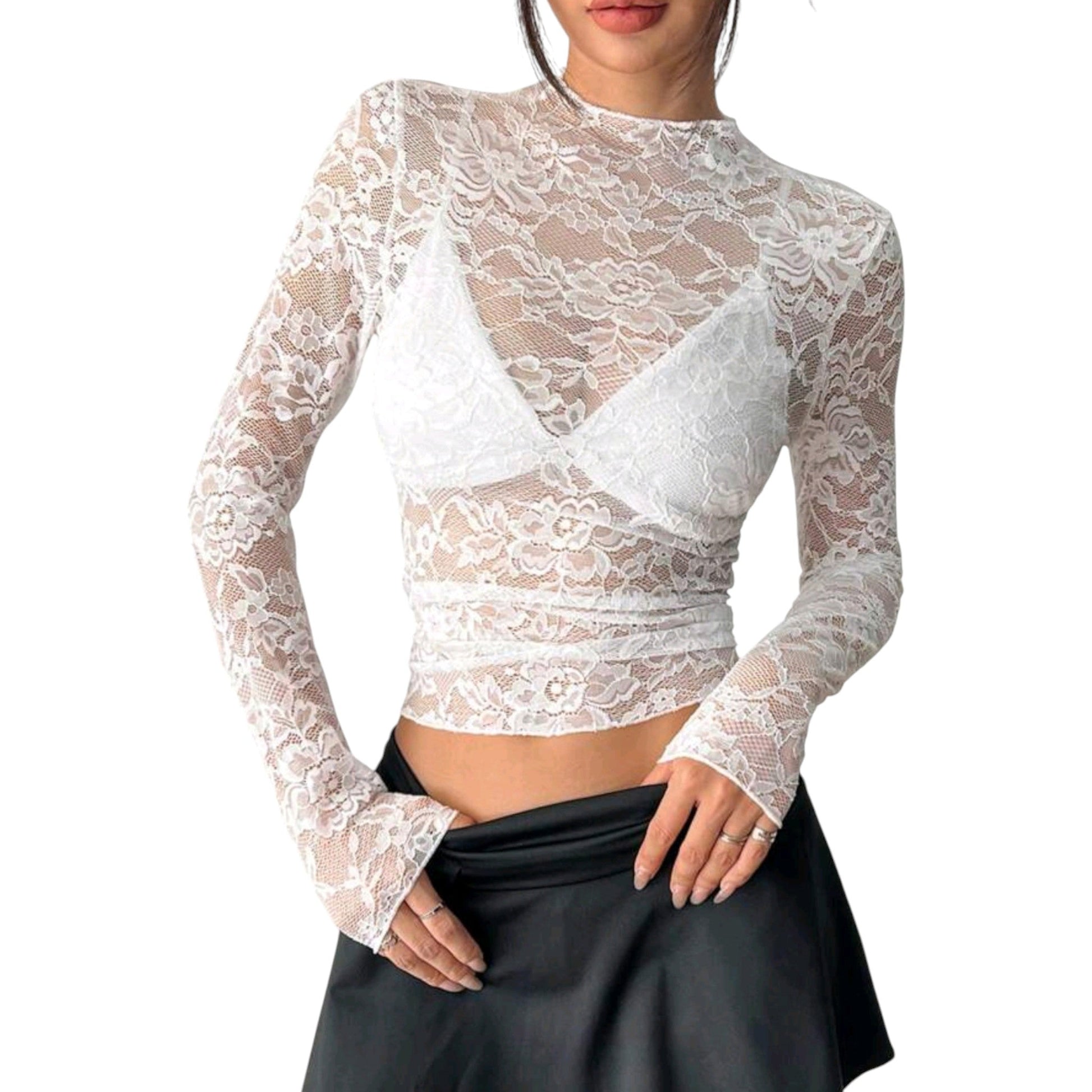 Címke nélküli, fehér, magas nyakú, hosszú ujjú, áttetsző csipkés felső