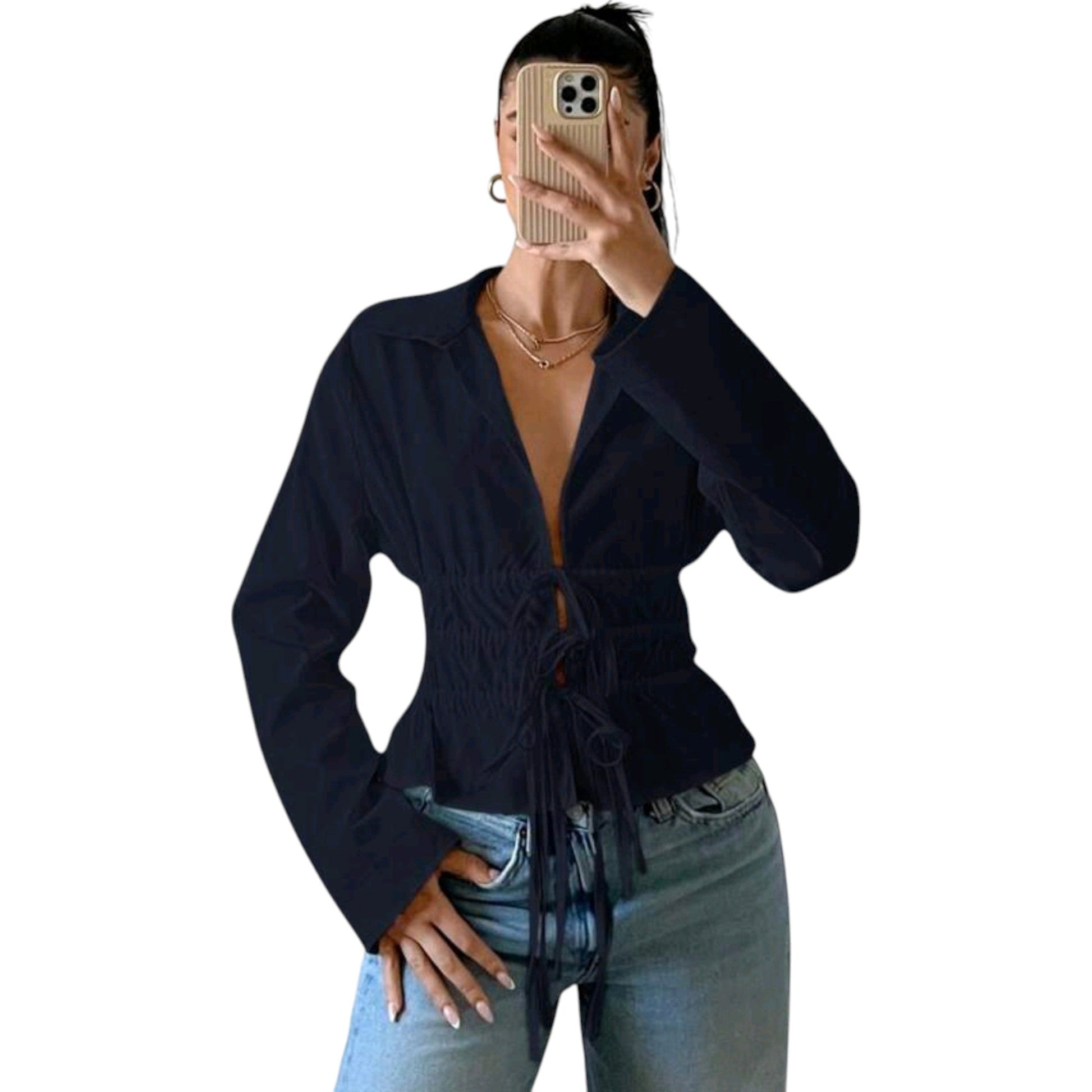 Címke nélküli, fekete, galléros, hosszú ujjú, mély V-nyakú, húzózsinóros ingblúz